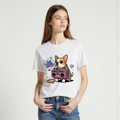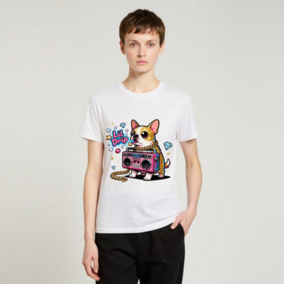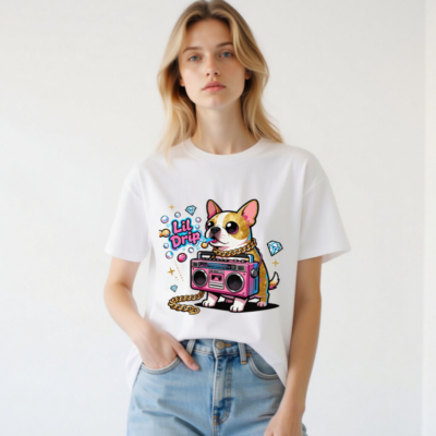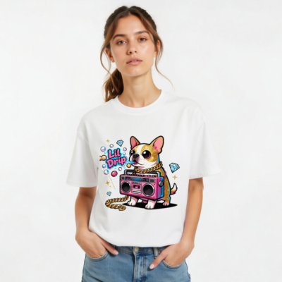 Show off your street style with this unisex organic cotton t-shirt featuring a vibrant ‘Lil Drip’ chihuahua holding a pink boombox, adorned with gold chain and sparkling diamonds. Designed for comfort and bold self-expression—soft, breathable, and eco-conscious. Perfect for casual wear or as a fun gift. Made with 100% certified organic cotton (no additional certifications listed).