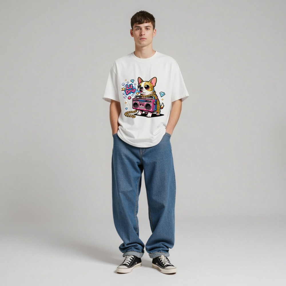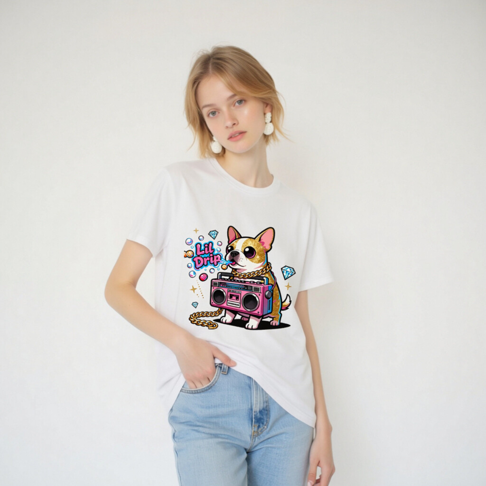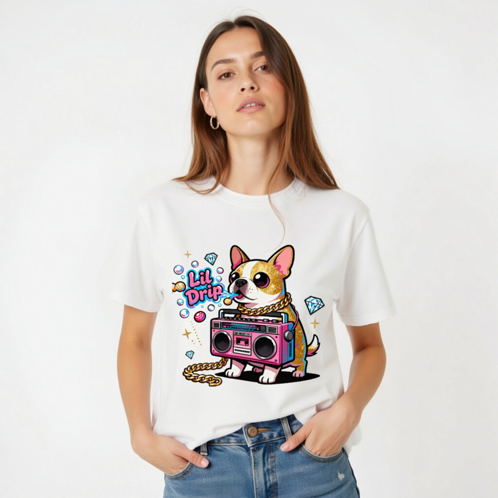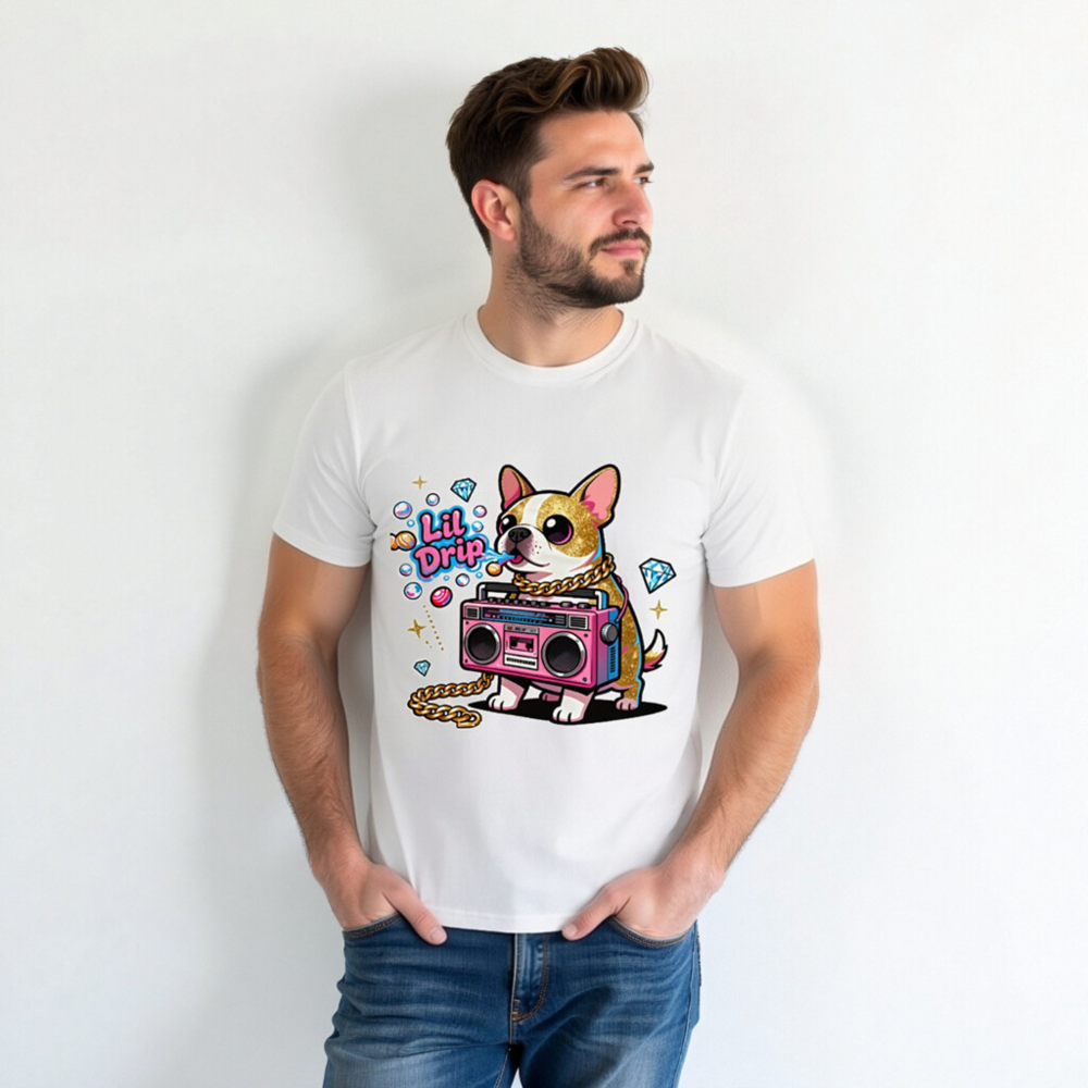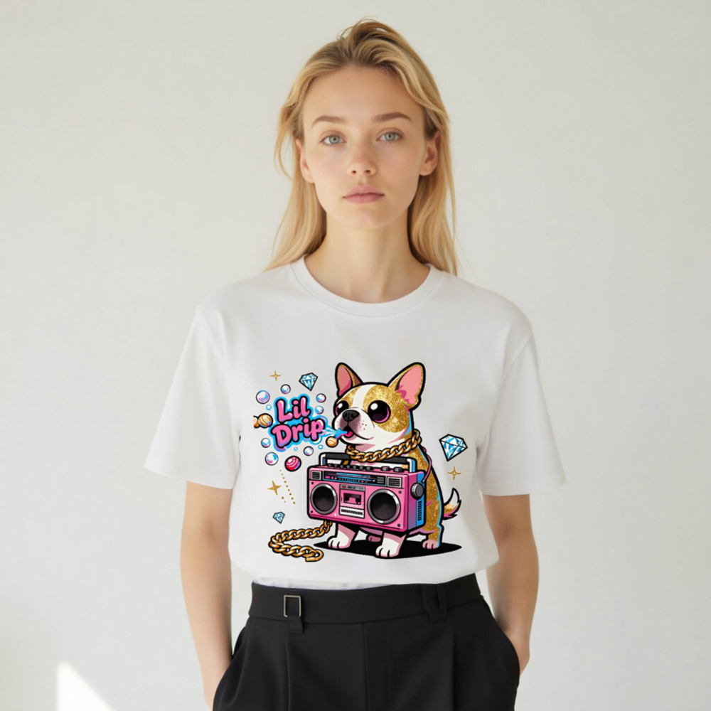 Show off your street style with this unisex organic cotton t-shirt featuring a vibrant ‘Lil Drip’ chihuahua holding a pink boombox, adorned with gold chain and sparkling diamonds. Designed for comfort and bold self-expression—soft, breathable, and eco-conscious. Perfect for casual wear or as a fun gift. Made with 100% certified organic cotton (no additional certifications listed).