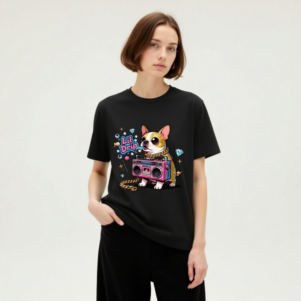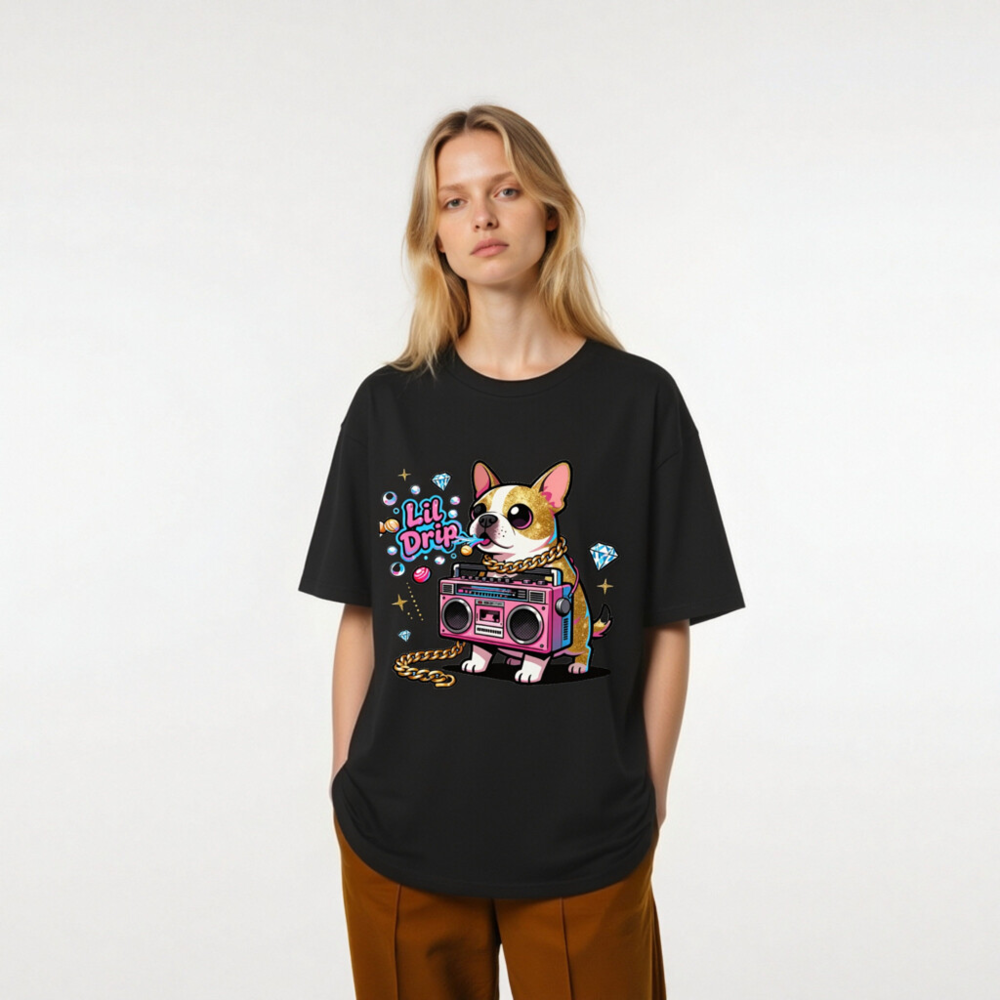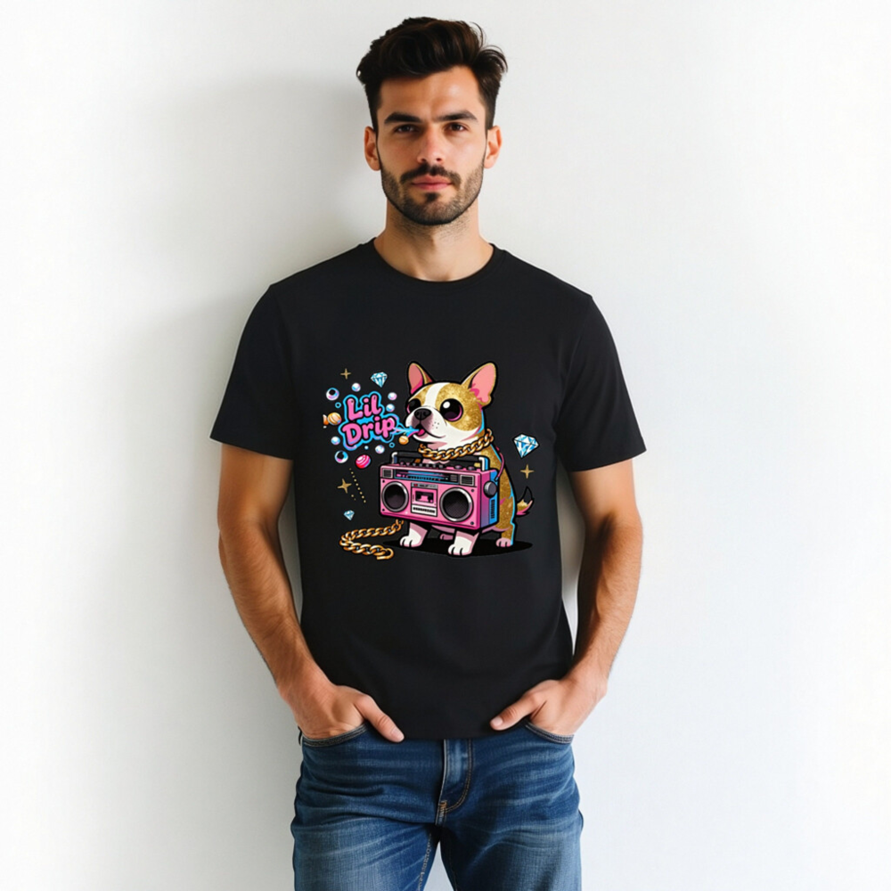 Show off your street style with this unisex organic cotton t-shirt featuring a vibrant ‘Lil Drip’ dog graphic—complete with pink boombox, gold chain, and sparkling diamonds. Soft, eco-friendly cotton for comfort and sustainability. Perfect for casual wear, gifts, or expressing bold personality. Designed for all genders, machine washable, and made with responsibly sourced organic cotton.