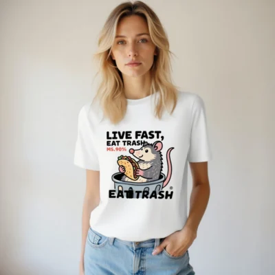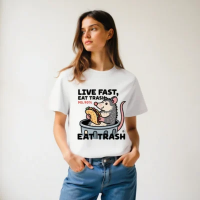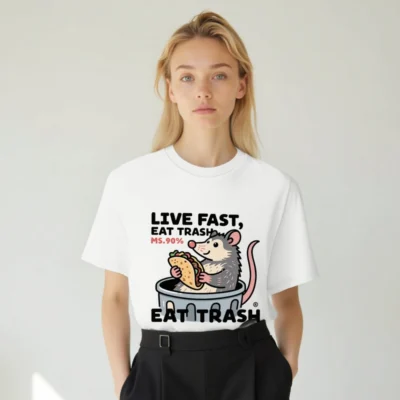This unisex organic cotton t-shirt features a playful opossum in a trash can holding a taco, with bold text ‘LIVE FAST, EAT TRASH’ and ‘MS.90%’—a humorous nod to the animal’s scavenging habits. Made from certified organic cotton for comfort and sustainability. Ideal for casual wear, humor lovers, and eco-conscious shoppers seeking unique, statement apparel.