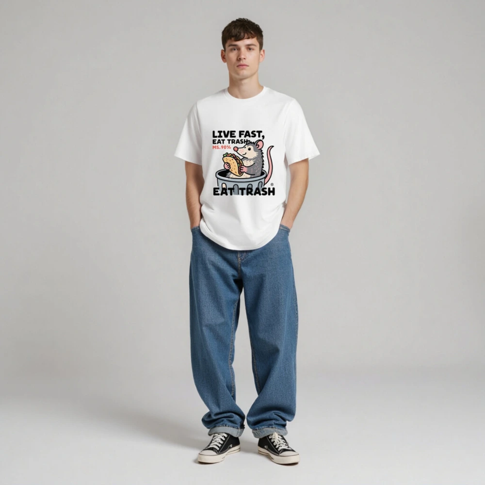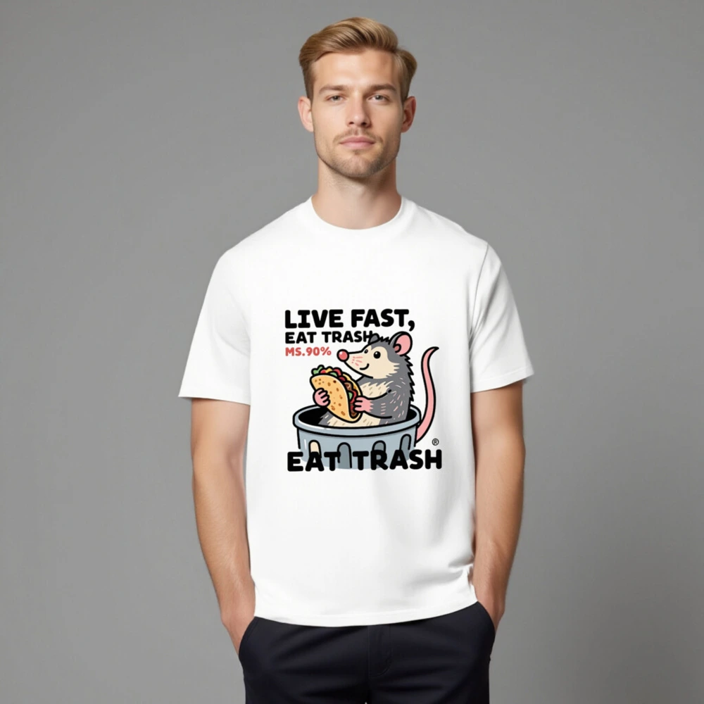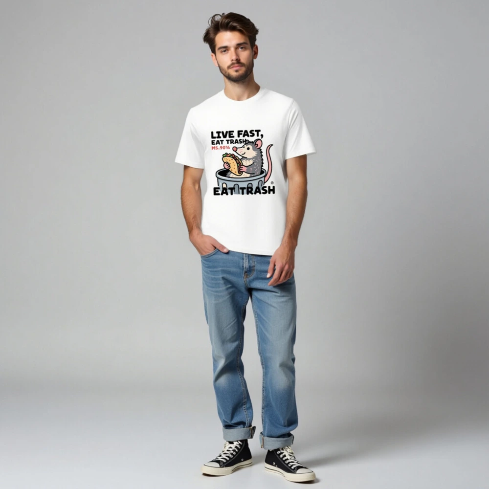 This unisex organic cotton t-shirt features a playful opossum in a trash can holding a taco, with bold text ‘LIVE FAST, EAT TRASH’ and ‘MS.90%’—a humorous nod to the animal’s scavenging habits. Made from certified organic cotton for comfort and sustainability. Ideal for casual wear, humor lovers, and eco-conscious shoppers seeking unique, statement apparel.