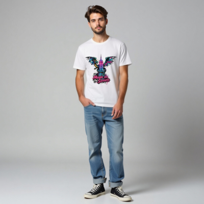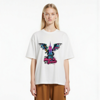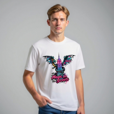 Wear urban fantasy with this unisex organic cotton t-shirt featuring a vibrant dragon coiling around the Empire State Building, styled with neon graffiti accents. ‘Magic In The Streets’ text adds bold street-art flair. Soft, breathable, and eco-conscious—made from certified organic cotton for comfort and sustainability. Ideal for fans of fantasy, cityscape art, and expressive streetwear.