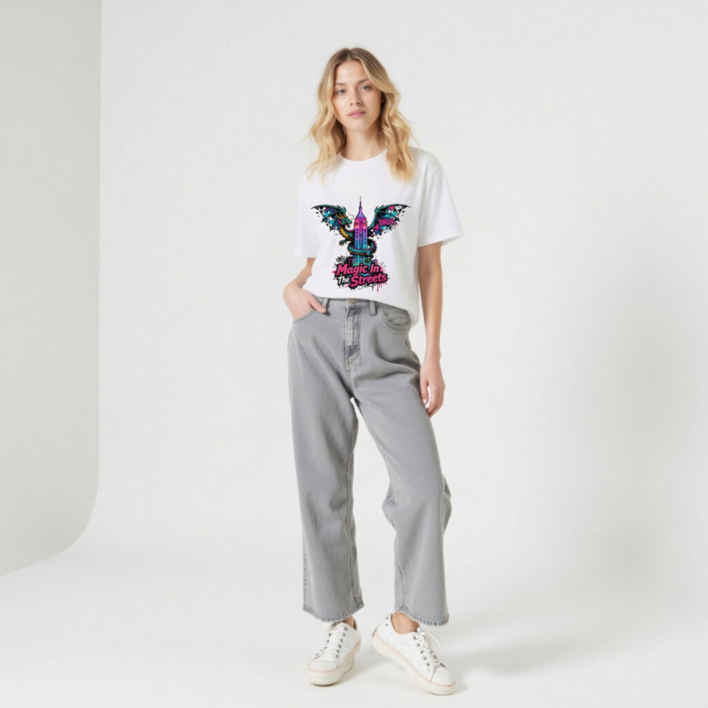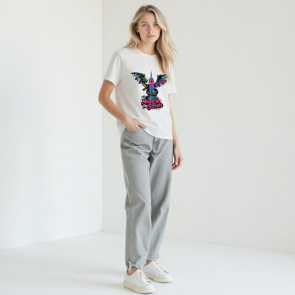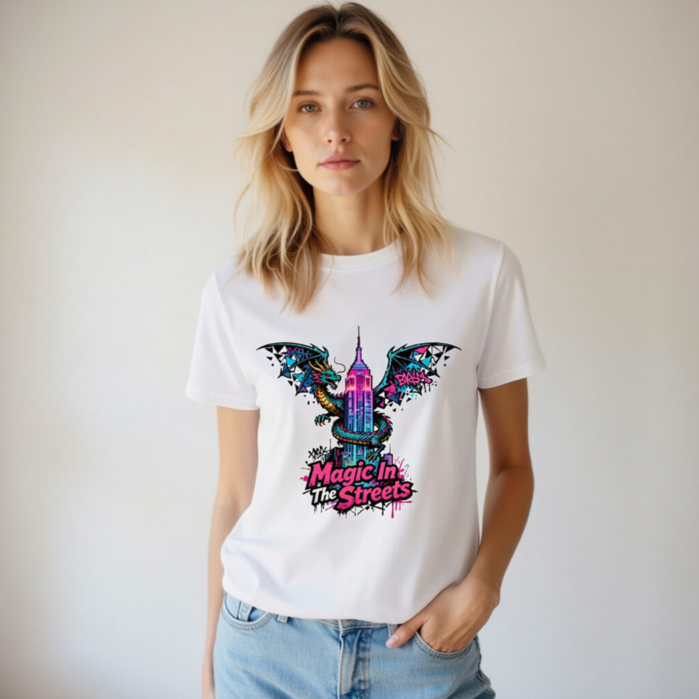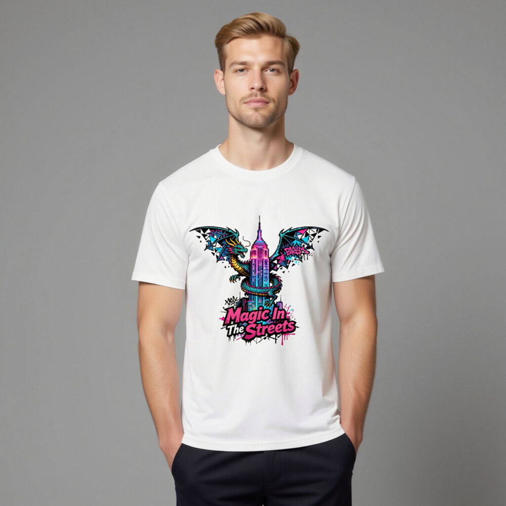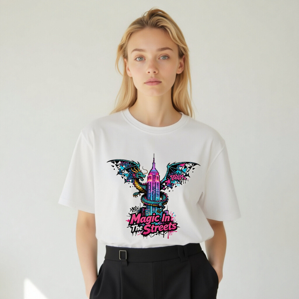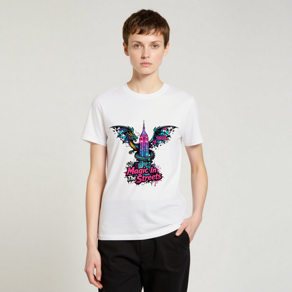 Wear urban fantasy with this unisex organic cotton t-shirt featuring a vibrant dragon coiling around the Empire State Building, styled with neon graffiti accents. ‘Magic In The Streets’ text adds bold street-art flair. Soft, breathable, and eco-conscious—made from certified organic cotton for comfort and sustainability. Ideal for fans of fantasy, cityscape art, and expressive streetwear.