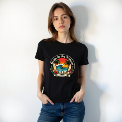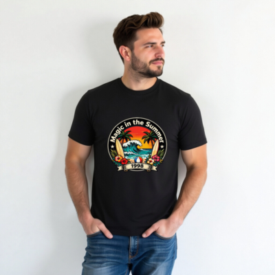 Celebrate summer nostalgia with this unisex organic cotton t-shirt featuring a vibrant vintage-style ‘Magic in the Summer 1998’ design: tropical sunset, palm trees, surfboards, hibiscus flowers, and a beach ball. Soft, sustainable, and proudly made for all. Perfect gift for 1998 lovers or beach enthusiasts.