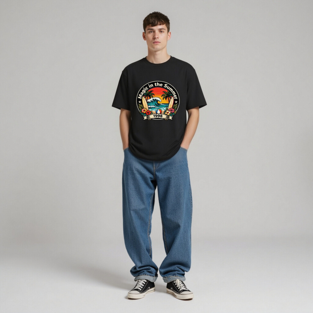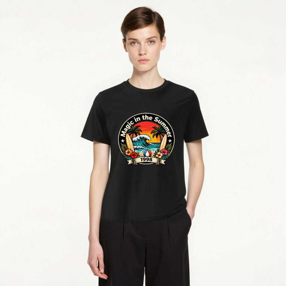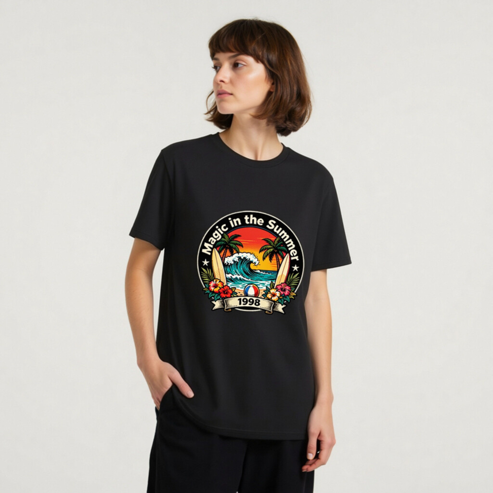 Celebrate summer nostalgia with this unisex organic cotton t-shirt featuring a vibrant vintage-style ‘Magic in the Summer 1998’ design: tropical sunset, palm trees, surfboards, hibiscus flowers, and a beach ball. Soft, sustainable, and proudly made for all. Perfect gift for 1998 lovers or beach enthusiasts.