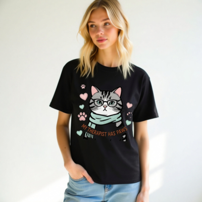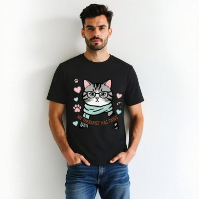 Show your love for cats and therapy with this unisex organic cotton t-shirt featuring a charming tabby cat in glasses and a scarf, surrounded by paw prints and hearts. The playful ‘My Therapist Has Paws’ slogan makes it perfect for animal lovers. Soft, sustainable, and stylish—ideal for everyday wear.