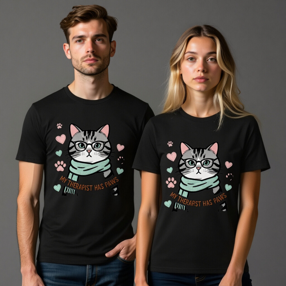 Show your love for cats and therapy with this unisex organic cotton t-shirt featuring a charming tabby cat in glasses and a scarf, surrounded by paw prints and hearts. The playful ‘My Therapist Has Paws’ slogan makes it perfect for animal lovers. Soft, sustainable, and stylish—ideal for everyday wear.