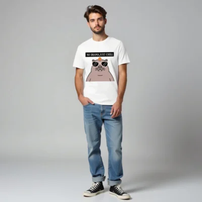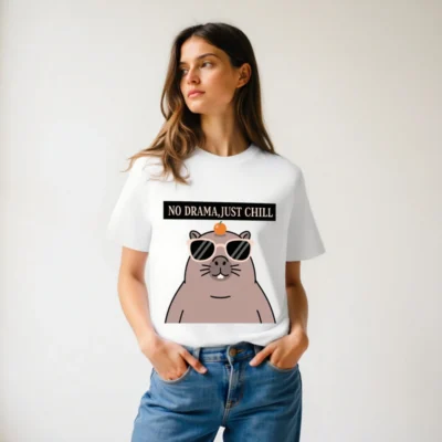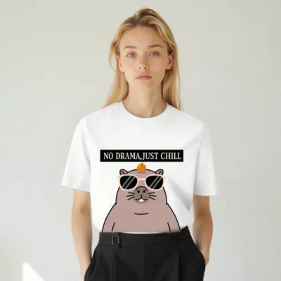 Chill in style with this unisex organic cotton t-shirt featuring a playful capybara wearing sunglasses and balancing an orange on its head. The bold ‘NO DRAMA, JUST CHILL’ slogan adds humor and positivity. Made from certified organic cotton for comfort and sustainability. Perfect for casual wear, gifts, or self-expression—soft, breathable, and ethically crafted.