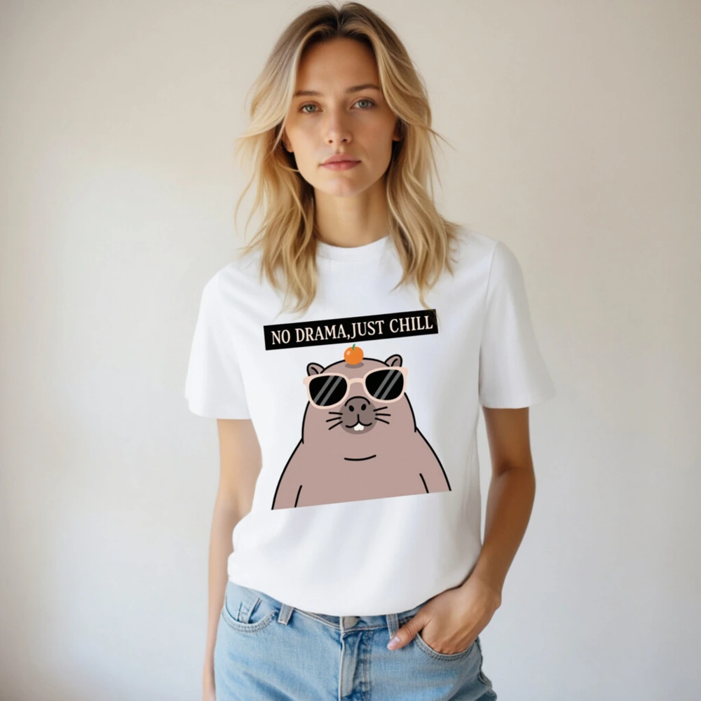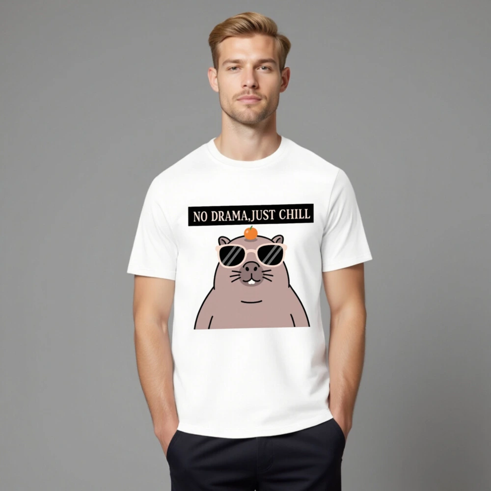 Chill in style with this unisex organic cotton t-shirt featuring a playful capybara wearing sunglasses and balancing an orange on its head. The bold ‘NO DRAMA, JUST CHILL’ slogan adds humor and positivity. Made from certified organic cotton for comfort and sustainability. Perfect for casual wear, gifts, or self-expression—soft, breathable, and ethically crafted.