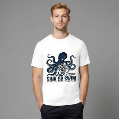 Handcrafted unisex organic cotton t-shirt featuring a bold navy octopus and pirate skeleton graphic with anchor and chain, paired with the iconic ‘SINK OR SWIM’ slogan. Soft, breathable, and eco-conscious—made from certified organic cotton for comfort and sustainability. Perfect for ocean lovers, pirates, and those who embrace adventurous spirit.