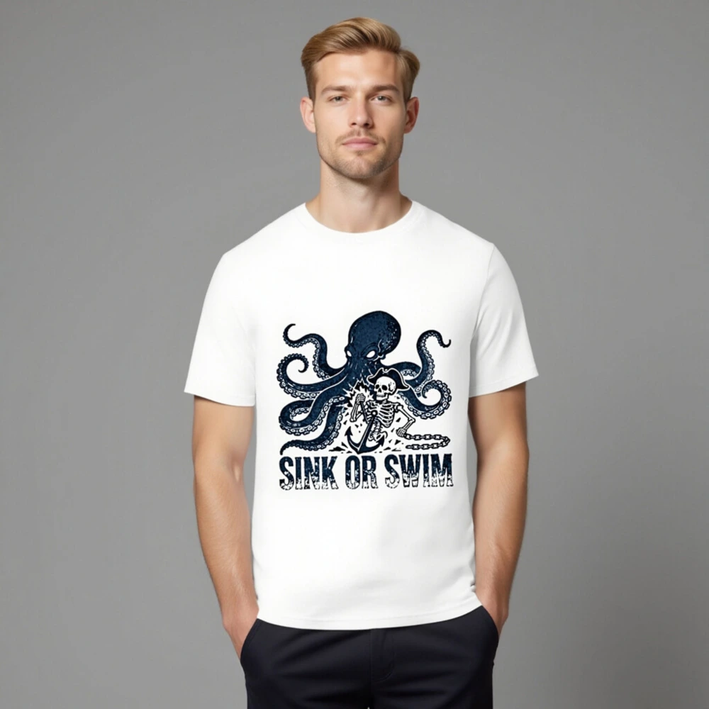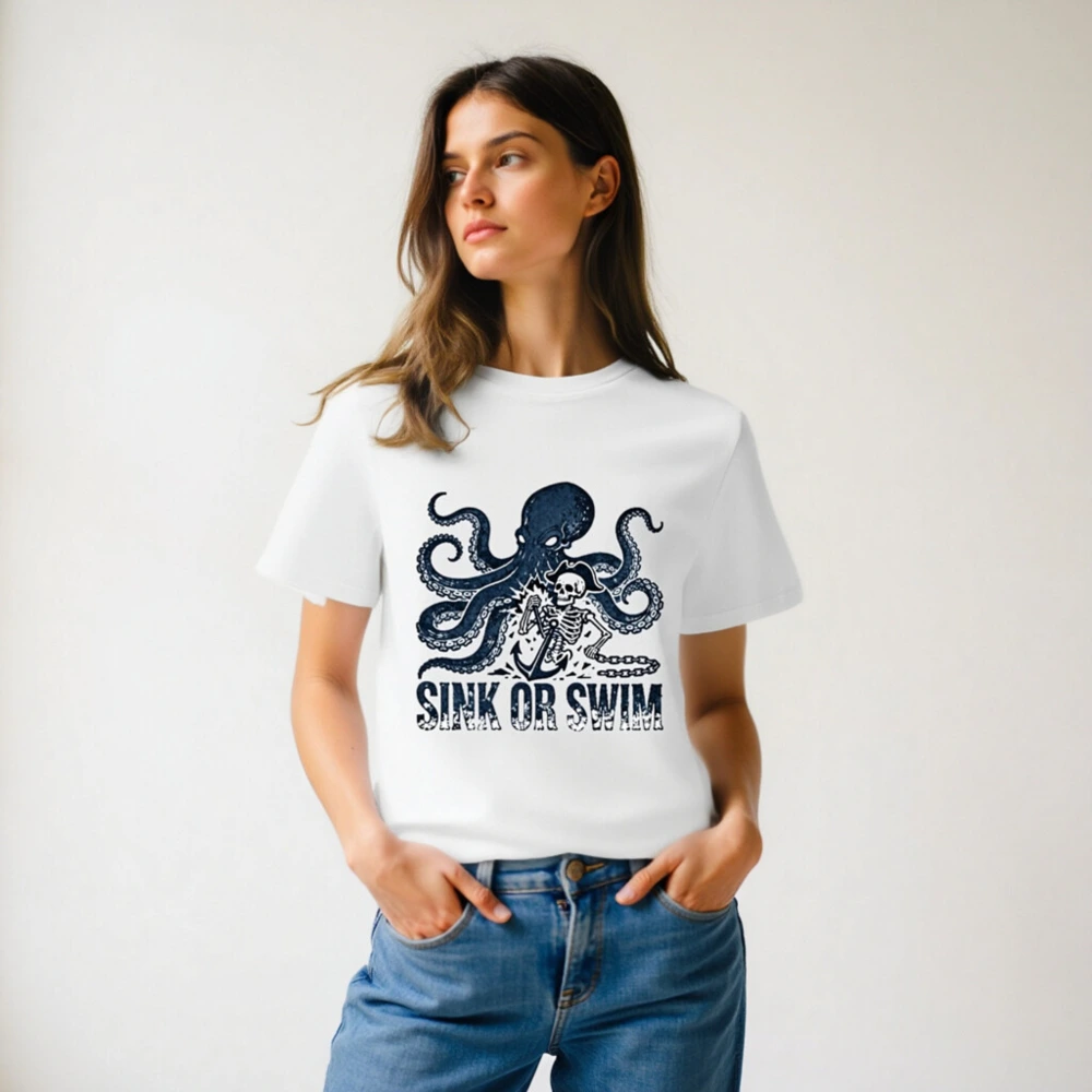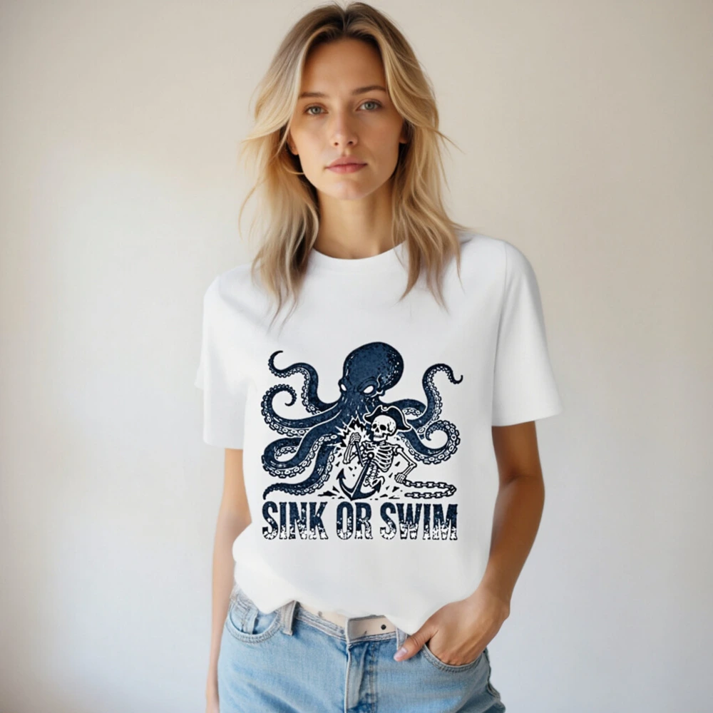 Handcrafted unisex organic cotton t-shirt featuring a bold navy octopus and pirate skeleton graphic with anchor and chain, paired with the iconic ‘SINK OR SWIM’ slogan. Soft, breathable, and eco-conscious—made from certified organic cotton for comfort and sustainability. Perfect for ocean lovers, pirates, and those who embrace adventurous spirit.