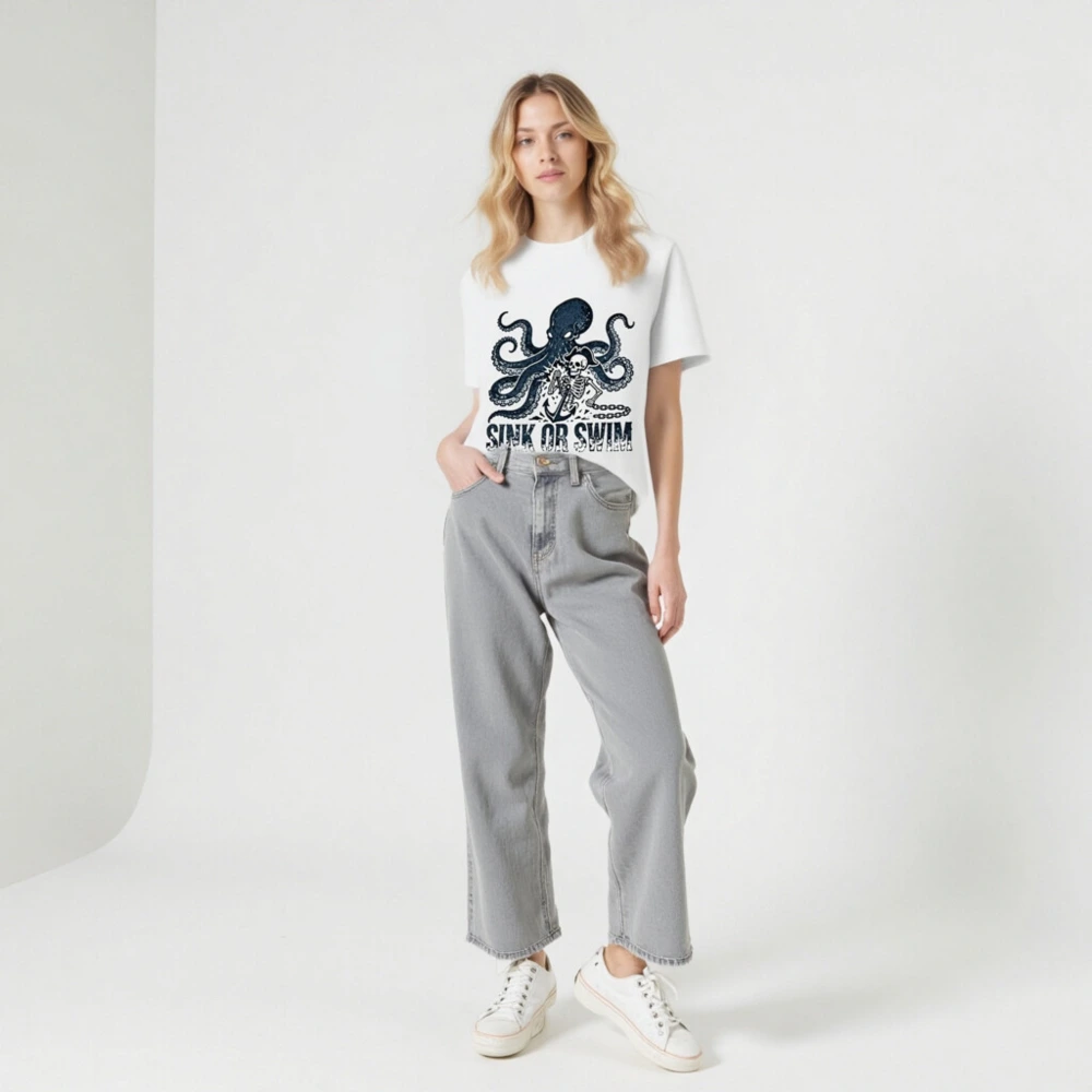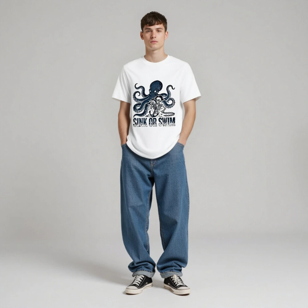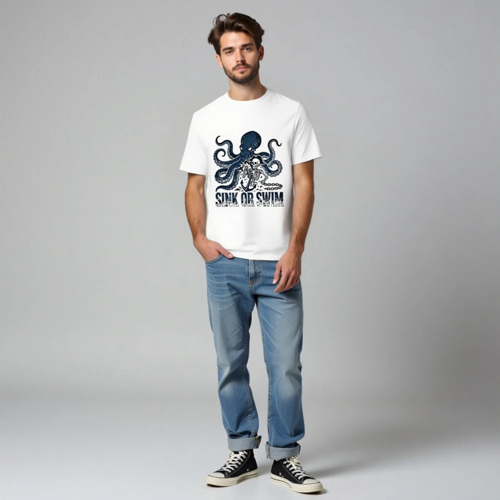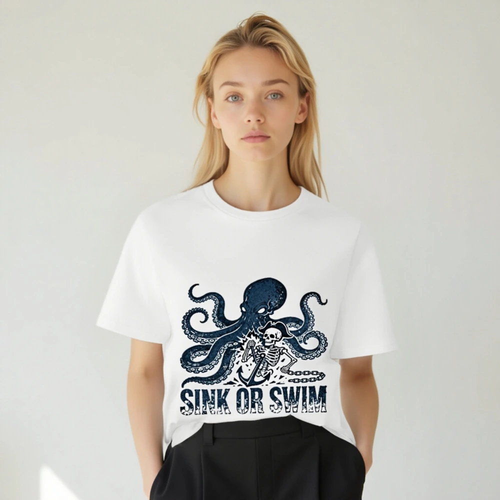 Handcrafted unisex organic cotton t-shirt featuring a bold navy octopus and pirate skeleton graphic with anchor and chain, paired with the iconic ‘SINK OR SWIM’ slogan. Soft, breathable, and eco-conscious—made from certified organic cotton for comfort and sustainability. Perfect for ocean lovers, pirates, and those who embrace adventurous spirit.