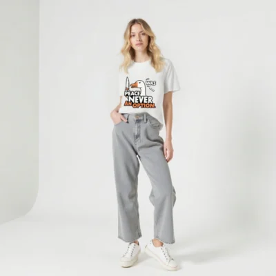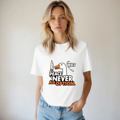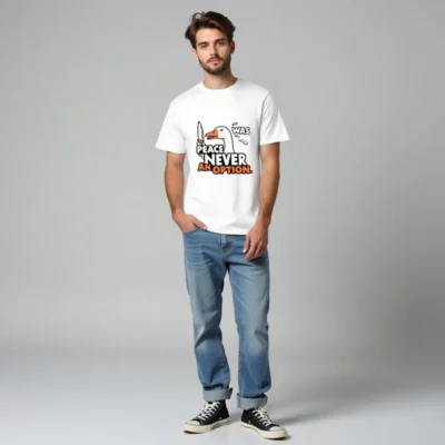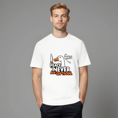 This unisex organic cotton t-shirt features a bold, humorous duck holding a knife with the iconic phrase ‘PEACE WAS NEVER AN OPTION.’ — a statement piece for those who embrace irreverent wit. Made from certified organic cotton, it’s soft, sustainable, and designed for everyday wear. The eye-catching graphic combines pop-art styling with sharp typography in white and orange. Ideal for fans of edgy satire and comfort-first fashion. Size: S-3XL. Machine washable.