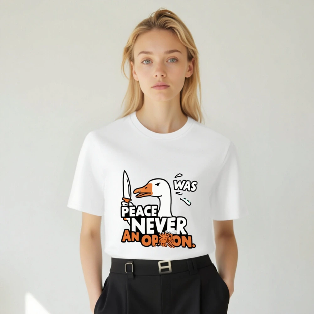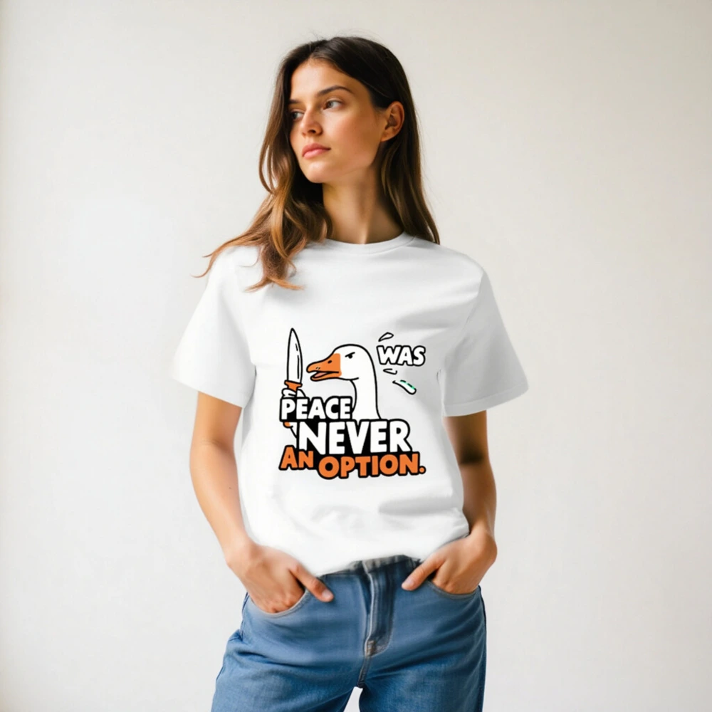 This unisex organic cotton t-shirt features a bold, humorous duck holding a knife with the iconic phrase ‘PEACE WAS NEVER AN OPTION.’ — a statement piece for those who embrace irreverent wit. Made from certified organic cotton, it’s soft, sustainable, and designed for everyday wear. The eye-catching graphic combines pop-art styling with sharp typography in white and orange. Ideal for fans of edgy satire and comfort-first fashion. Size: S-3XL. Machine washable.