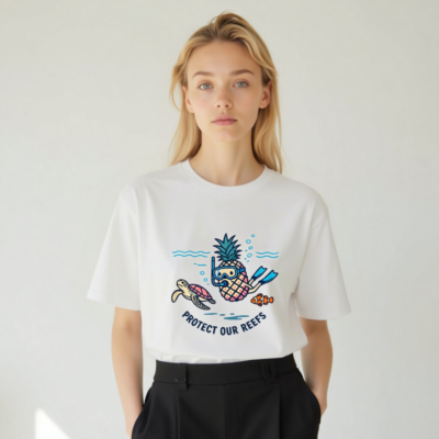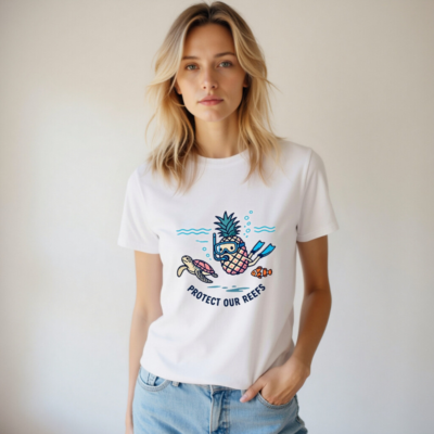 This unisex organic cotton t-shirt features a playful underwater design: a pineapple wearing snorkeling gear, swimming alongside a sea turtle and a clownfish. The cheerful illustration promotes ocean conservation with the message ‘Protect Our Reefs’. Made from certified organic cotton for comfort and sustainability. Ideal for eco-conscious adventurers and reef lovers.