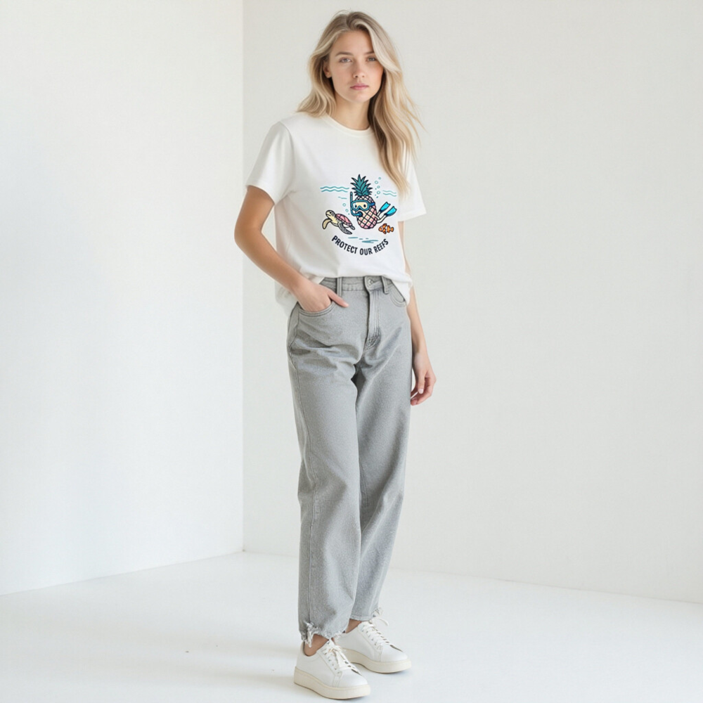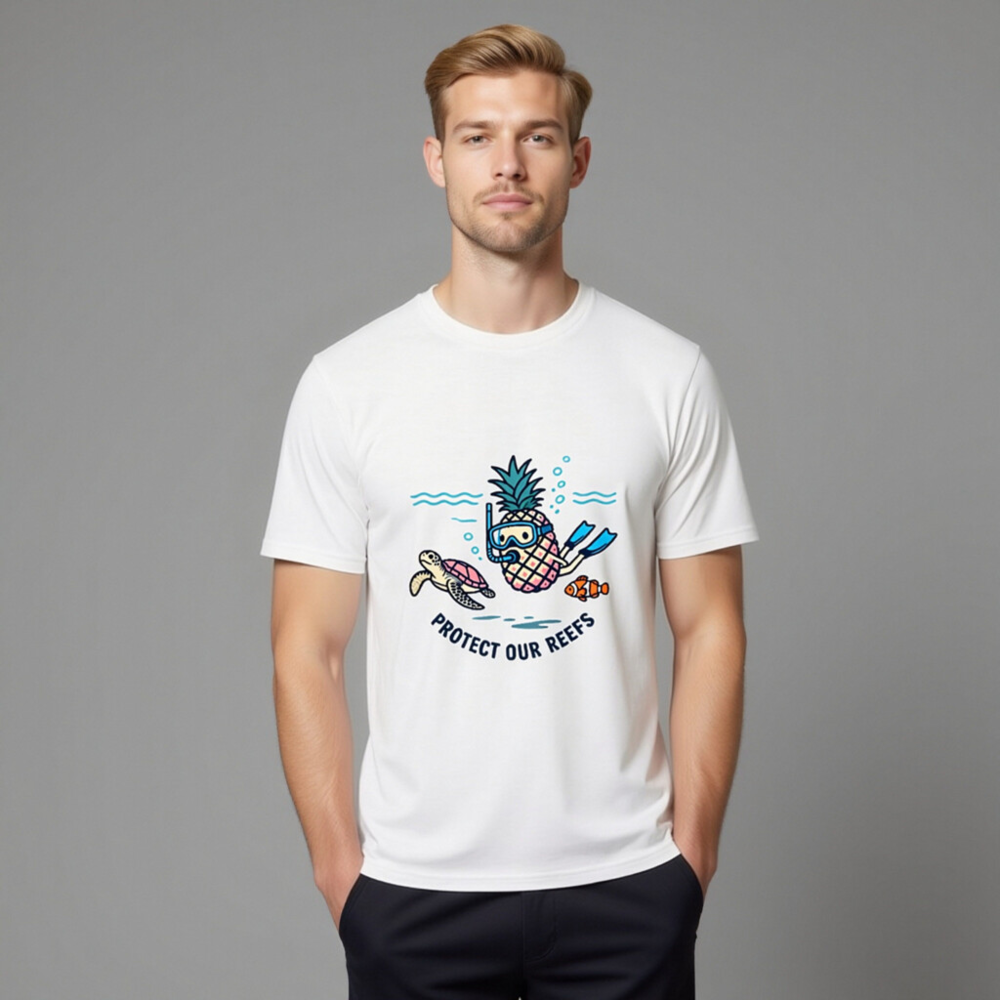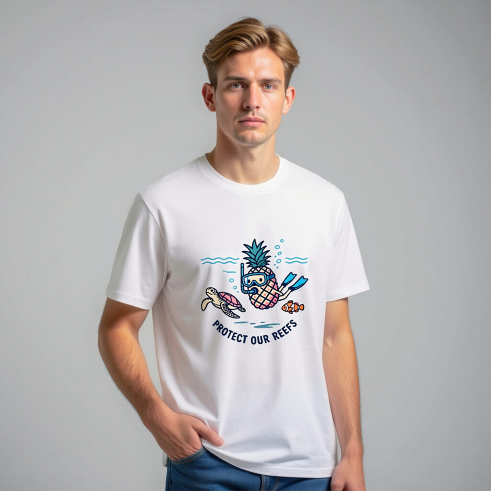This unisex organic cotton t-shirt features a playful underwater design: a pineapple wearing snorkeling gear, swimming alongside a sea turtle and a clownfish. The cheerful illustration promotes ocean conservation with the message ‘Protect Our Reefs’. Made from certified organic cotton for comfort and sustainability. Ideal for eco-conscious adventurers and reef lovers.