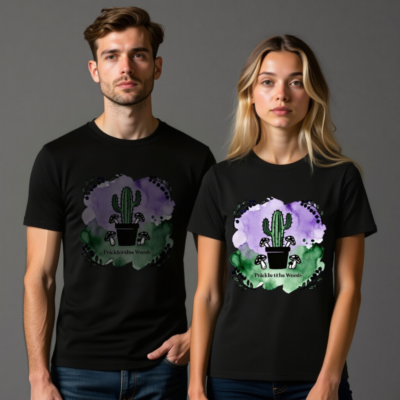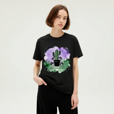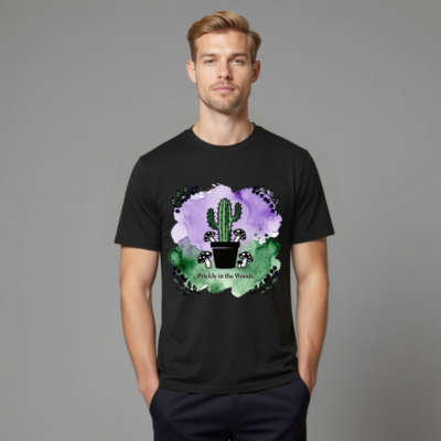 Handcrafted unisex organic cotton t-shirt featuring a whimsical watercolor design: a potted cactus with mushrooms and berry vines, inspired by forest and desert motifs. Soft, breathable, and sustainably made for everyday comfort. Ideal for nature lovers and unique style seekers. Ethically produced with certified organic cotton.
