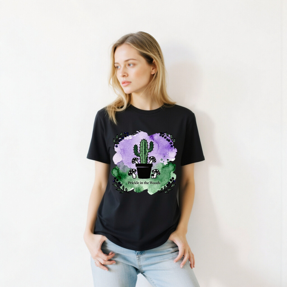 Handcrafted unisex organic cotton t-shirt featuring a whimsical watercolor design: a potted cactus with mushrooms and berry vines, inspired by forest and desert motifs. Soft, breathable, and sustainably made for everyday comfort. Ideal for nature lovers and unique style seekers. Ethically produced with certified organic cotton.