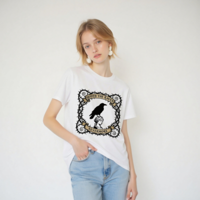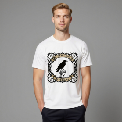 Wear timeless gothic elegance with this unisex organic cotton t-shirt, featuring a striking design of a raven perched atop a classical statue head, framed by thorny vines and vintage banners reading ‘Quoth the Raven’ and ‘Nevermore’. Soft, breathable, and ethically made for comfort and style. Perfect for Poe fans, goth lovers, and literary enthusiasts seeking unique, high-quality apparel.
