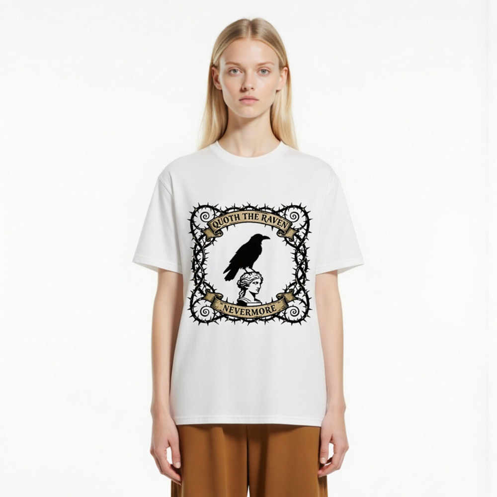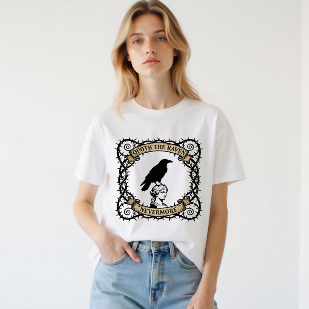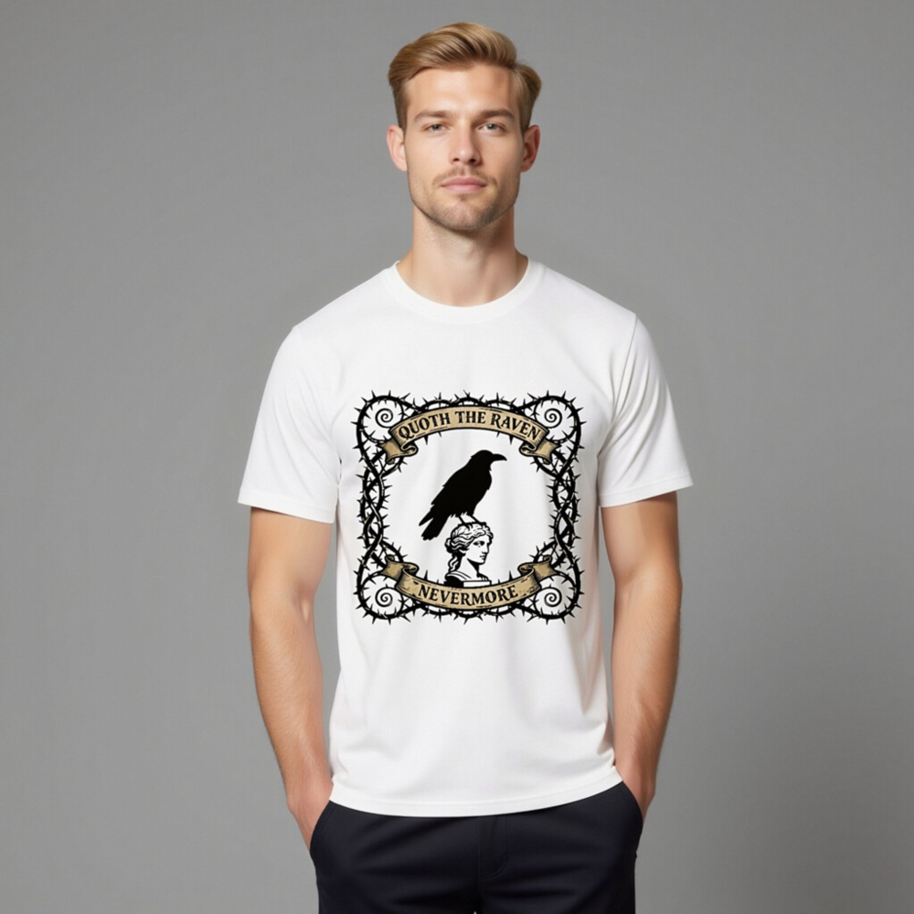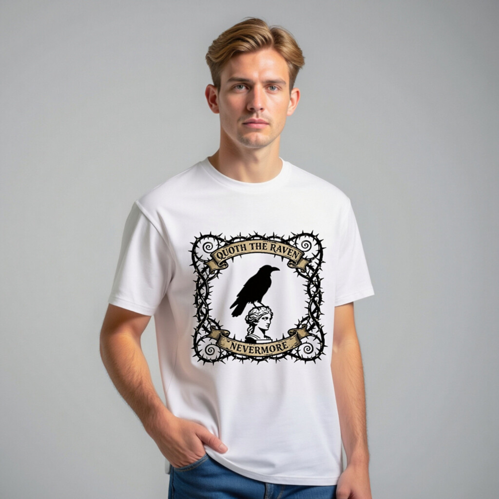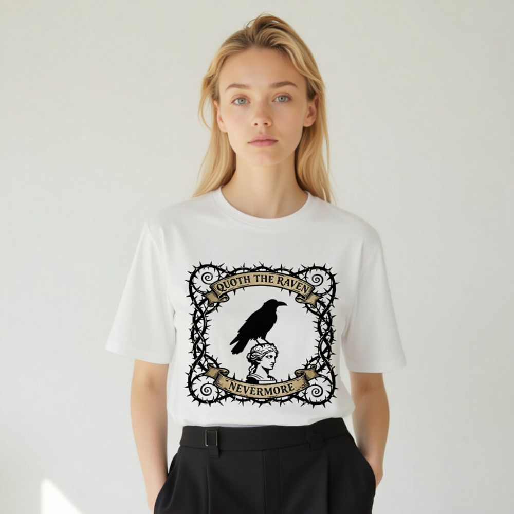 Wear timeless gothic elegance with this unisex organic cotton t-shirt, featuring a striking design of a raven perched atop a classical statue head, framed by thorny vines and vintage banners reading ‘Quoth the Raven’ and ‘Nevermore’. Soft, breathable, and ethically made for comfort and style. Perfect for Poe fans, goth lovers, and literary enthusiasts seeking unique, high-quality apparel.