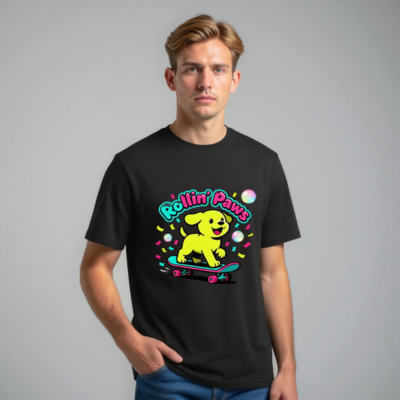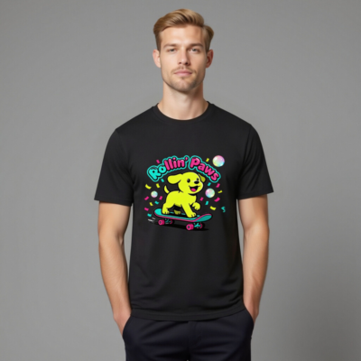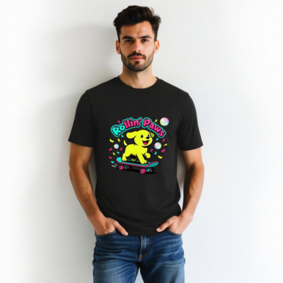 This unisex organic cotton t-shirt features a vibrant ‘Rollin’ Paws’ design: a cheerful yellow puppy riding a skateboard with colorful confetti and bubbles. Made from certified organic cotton for softness, comfort, and eco-conscious wear. Perfect for casual everyday style—fun, bold, and sustainable. Ideal for dog lovers and skate culture fans seeking quality, ethical apparel.