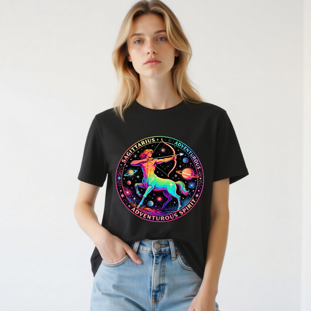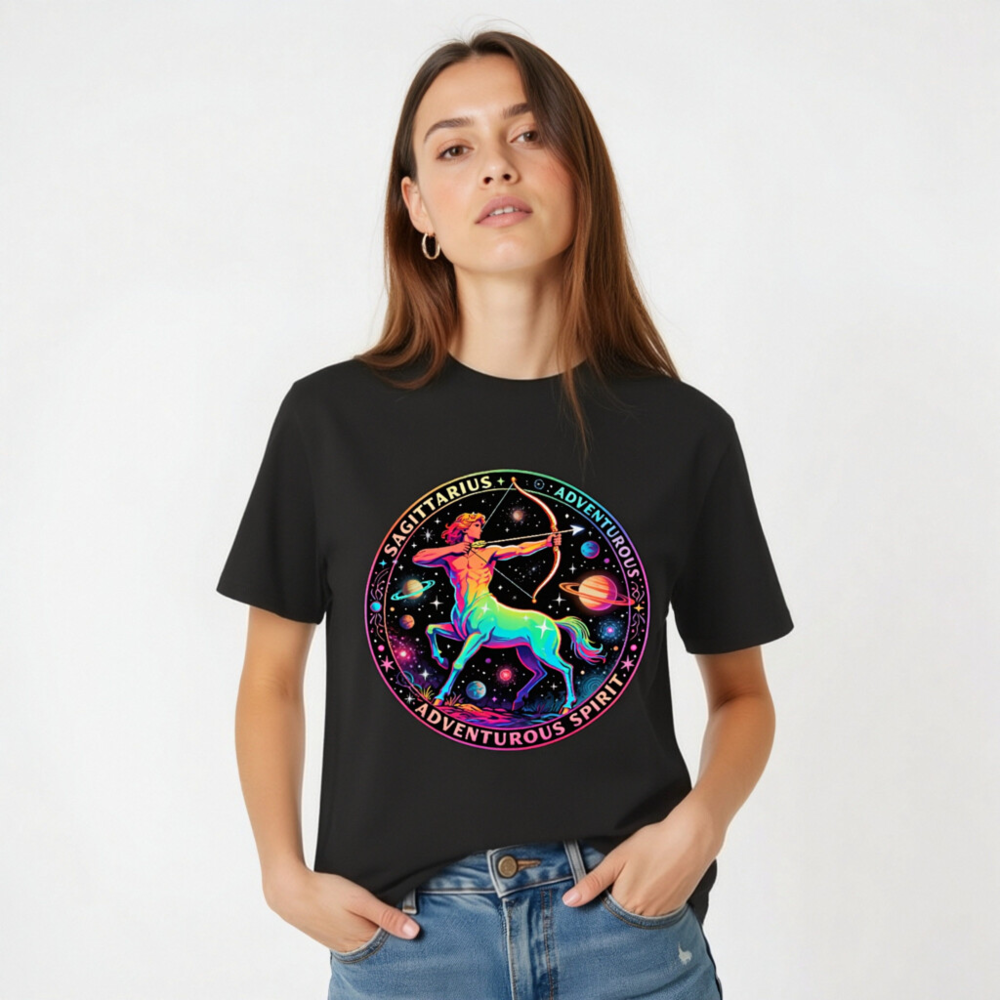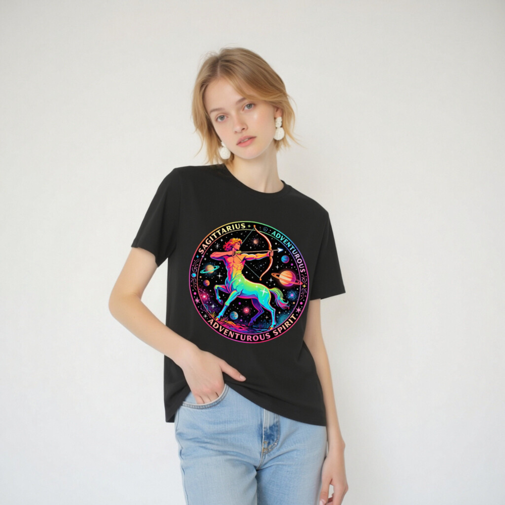 Celebrate your zodiac spirit with this unisex organic cotton t-shirt featuring a vibrant, rainbow-hued Sagittarius archer set against a cosmic backdrop of planets and stars. Designed for comfort and style, it embodies the adventurous energy of the Archer sign. Made from certified organic cotton — soft, sustainable, and skin-friendly. Perfect for astrology lovers, travelers, and dreamers who embrace curiosity and exploration.