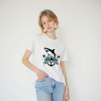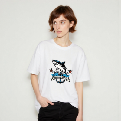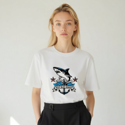 Show off your ocean spirit with this unisex organic cotton t-shirt featuring a bold shark leaping over waves, flanked by nautical stars and an anchor. The vintage-style ‘Deep Blue Danger’ banner adds retro charm. Made from certified organic cotton for comfort and sustainability—no synthetic blends, no harmful dyes. Perfect for beach lovers, sailors, and marine enthusiasts who value ethical fashion.