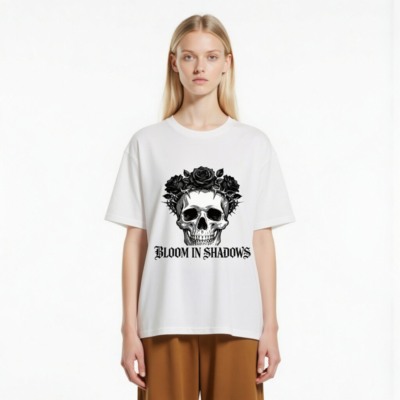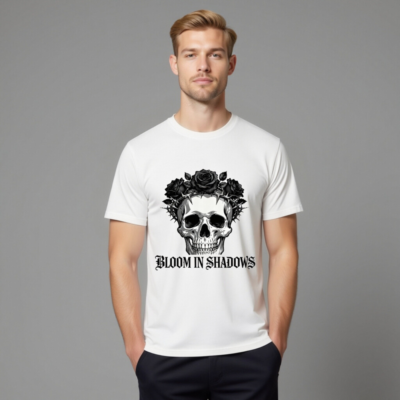Wear bold gothic elegance with this unisex organic cotton t-shirt. Featuring a striking black-and-white skull adorned with roses and thorns, crowned by a regal floral wreath. The phrase ‘Bloom in Shadows’ adds poetic depth. Made from certified organic cotton for comfort and sustainability. Ideal for alternative fashion lovers seeking timeless, high-contrast streetwear.