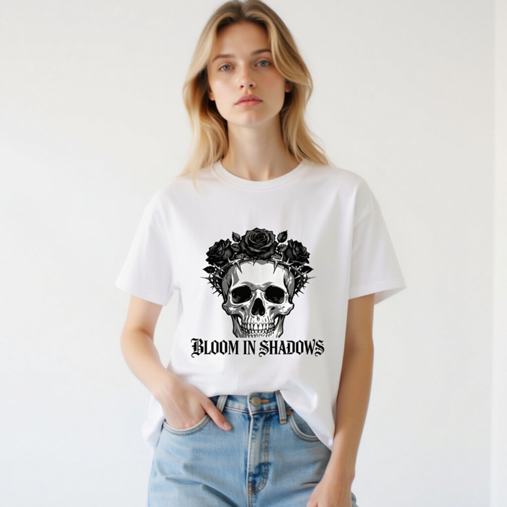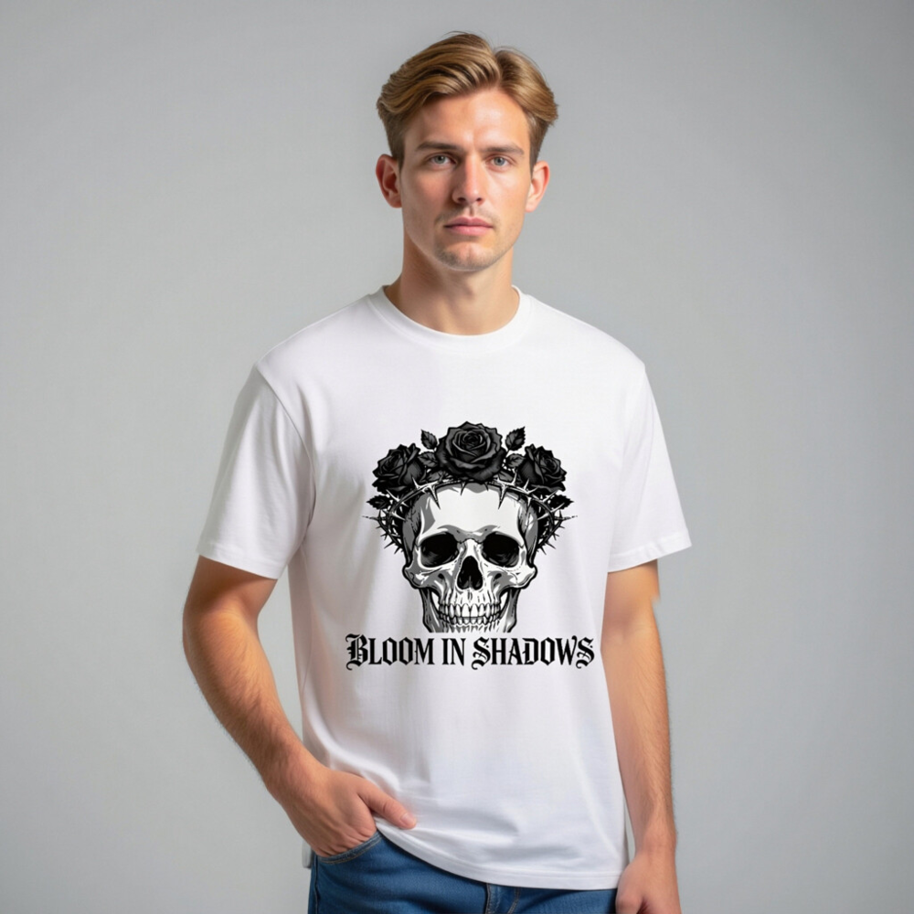 Wear bold gothic elegance with this unisex organic cotton t-shirt. Featuring a striking black-and-white skull adorned with roses and thorns, crowned by a regal floral wreath. The phrase ‘Bloom in Shadows’ adds poetic depth. Made from certified organic cotton for comfort and sustainability. Ideal for alternative fashion lovers seeking timeless, high-contrast streetwear.