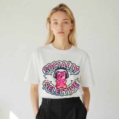 Show your personality with this unisex organic cotton t-shirt featuring a vibrant pink gummy bear wearing headphones, surrounded by the playful ‘Socially Selective’ text in gradient bubble letters. Soft, comfortable, and eco-conscious—made from certified organic cotton for sustainable style. Perfect for casual wear or as a fun gift.