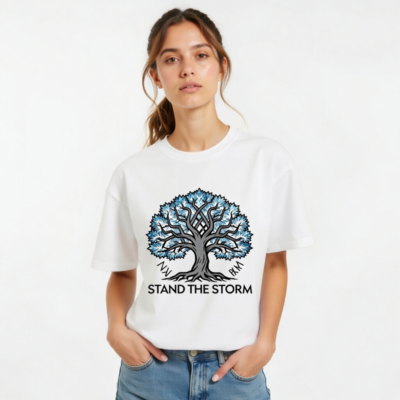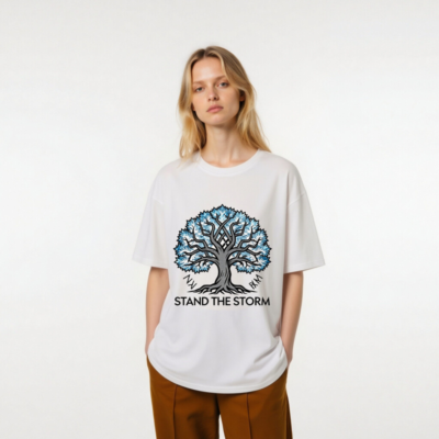 This unisex organic cotton t-shirt features a striking ‘Stand the Storm’ tree design with blue-leafed branches and Norse-inspired runes. Made from certified organic cotton for softness, durability, and eco-conscious wear. The bold graphic symbolizes resilience and nature’s strength—perfect for everyday comfort or meaningful gifting. Sustainable, breathable, and ethically crafted.