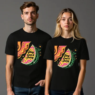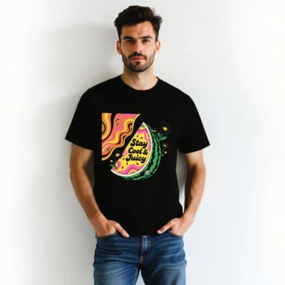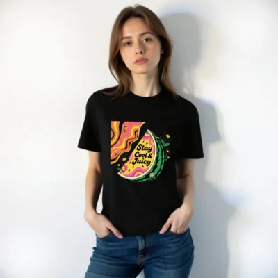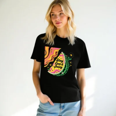 This unisex organic cotton t-shirt features a vibrant, retro-style watermelon slice with psychedelic swirls and daisies. The playful ‘Stay Cool & Juicy’ slogan adds summer charm. Made from certified organic cotton for comfort and sustainability. Ideal for casual wear—lightweight, soft, and eco-conscious.