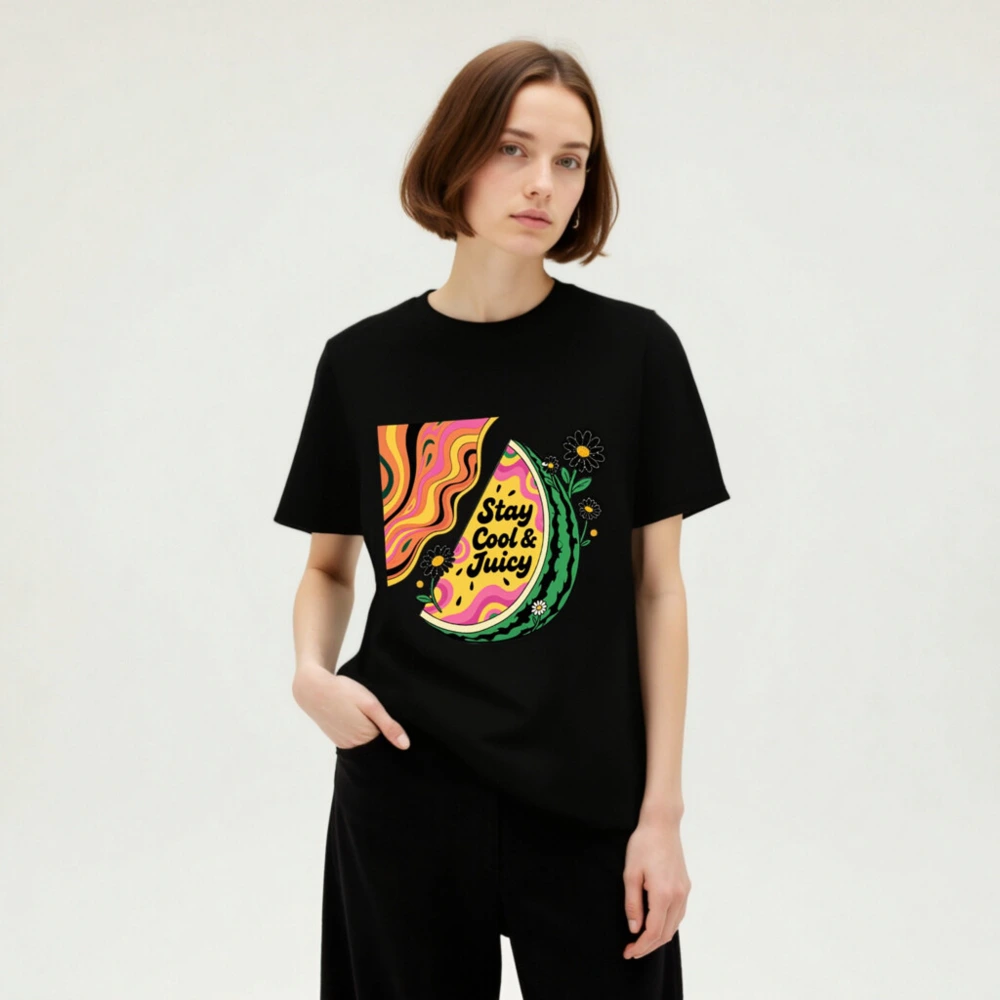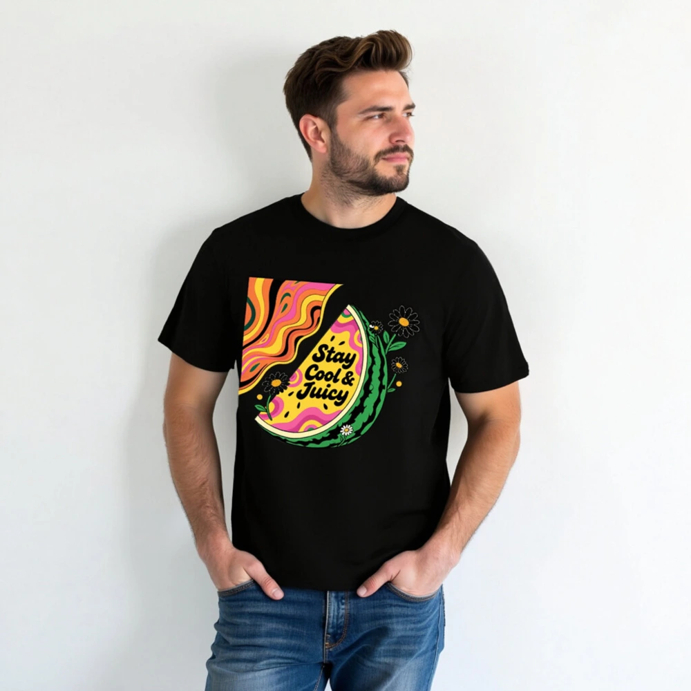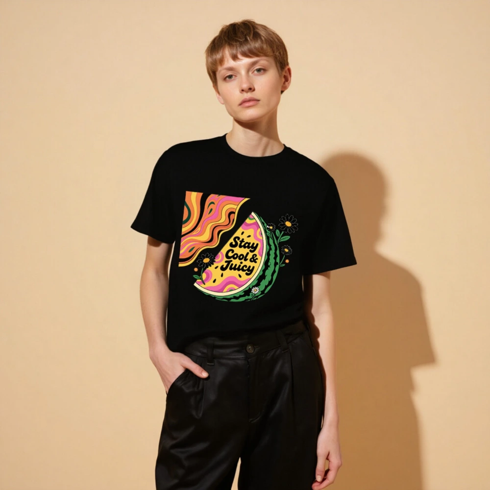 This unisex organic cotton t-shirt features a vibrant, retro-style watermelon slice with psychedelic swirls and daisies. The playful ‘Stay Cool & Juicy’ slogan adds summer charm. Made from certified organic cotton for comfort and sustainability. Ideal for casual wear—lightweight, soft, and eco-conscious.