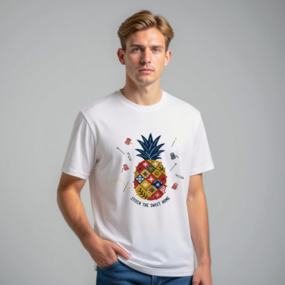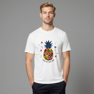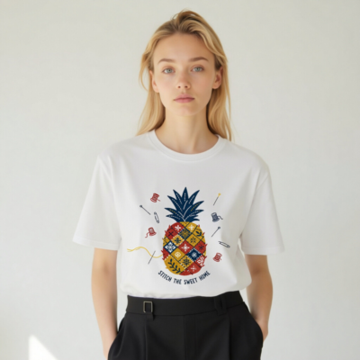 This unisex organic cotton t-shirt features a vibrant, hand-stitched pineapple design with floral patchwork and sewing motifs. The eco-friendly, soft cotton fabric is sustainably sourced, offering comfort and style for everyday wear. ‘Stitch the Sweet Home’ adds a cozy, craft-inspired charm—perfect for lovers of homey aesthetics and ethical fashion.
