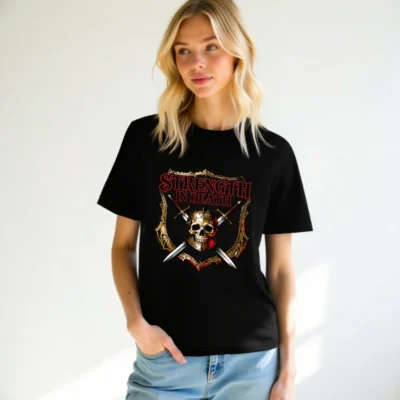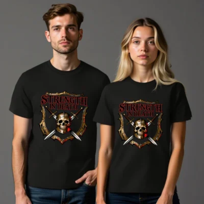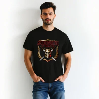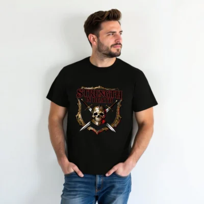 Premium unisex organic cotton t-shirt featuring bold ‘Strength in Death’ design with skull, crossed swords, and medieval shield. Soft, breathable fabric for everyday wear. Eco-friendly, fair-trade certified materials. Ideal for gamers, metal fans, and history lovers. Comfortable fit, durable print, sustainable fashion choice.