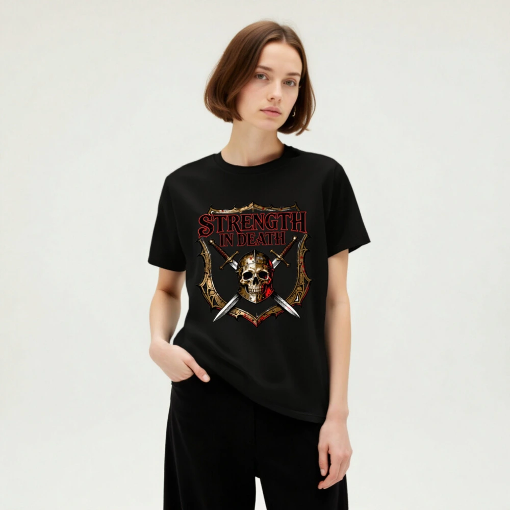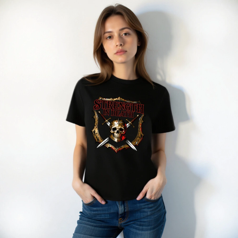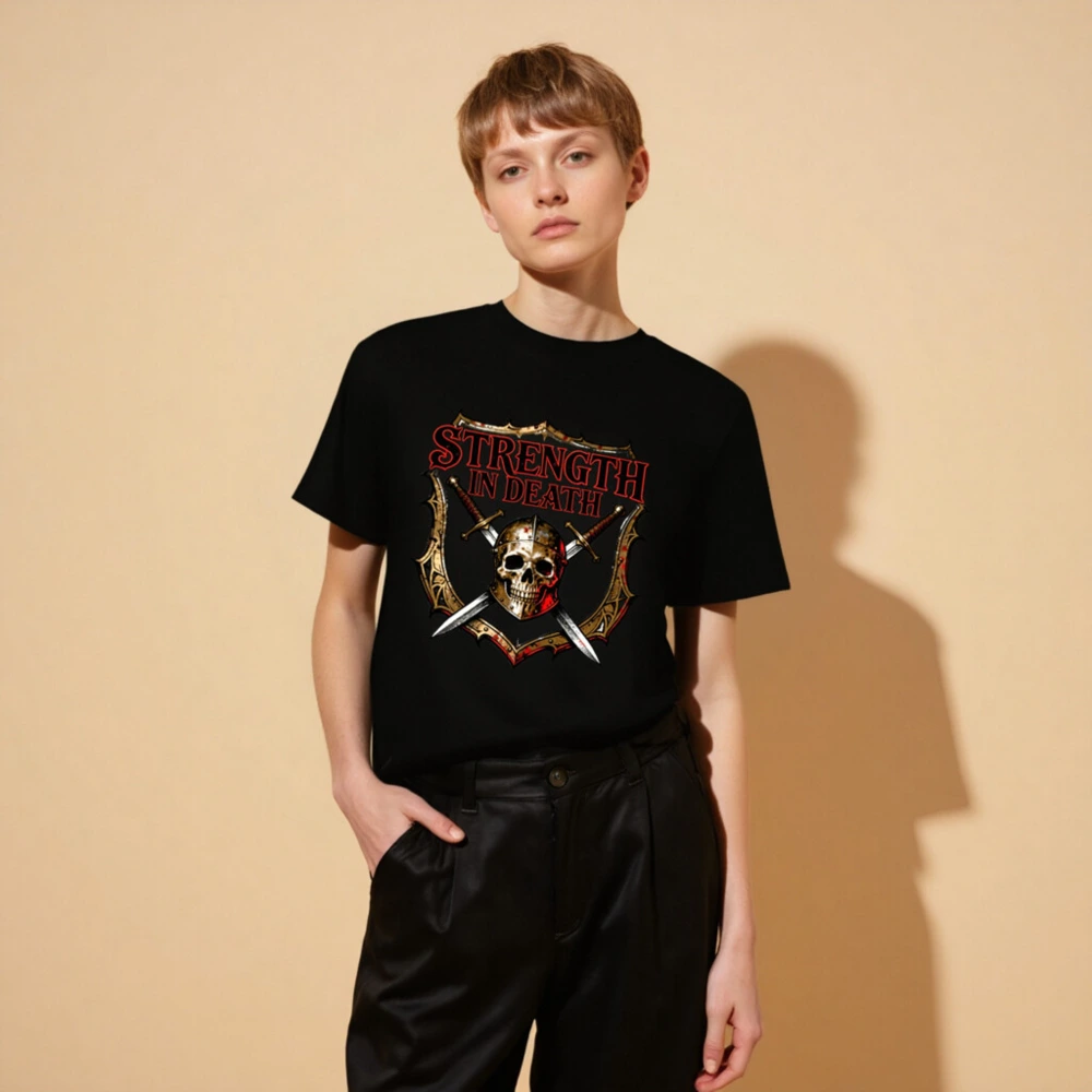 Premium unisex organic cotton t-shirt featuring bold ‘Strength in Death’ design with skull, crossed swords, and medieval shield. Soft, breathable fabric for everyday wear. Eco-friendly, fair-trade certified materials. Ideal for gamers, metal fans, and history lovers. Comfortable fit, durable print, sustainable fashion choice.
