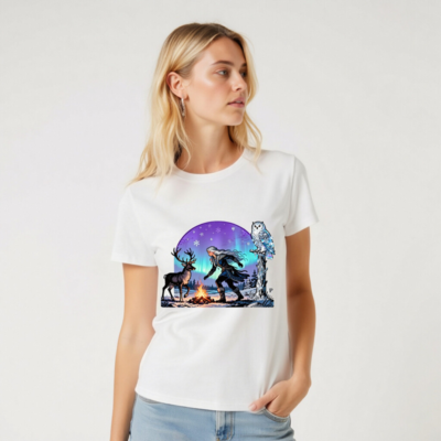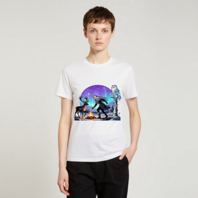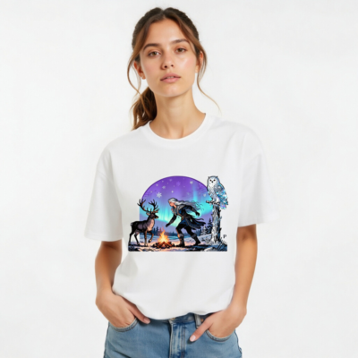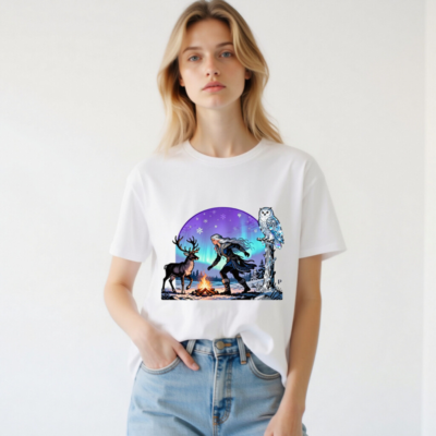 Handcrafted unisex organic cotton t-shirt featuring a magical winter scene: an elf with silver hair, a majestic reindeer, and a snowy owl perched on a frosty tree beside a cozy campfire under the aurora borealis. Eco-friendly, soft, and sustainable—perfect for nature lovers and fantasy fans. Ideal for casual wear or as a unique gift.