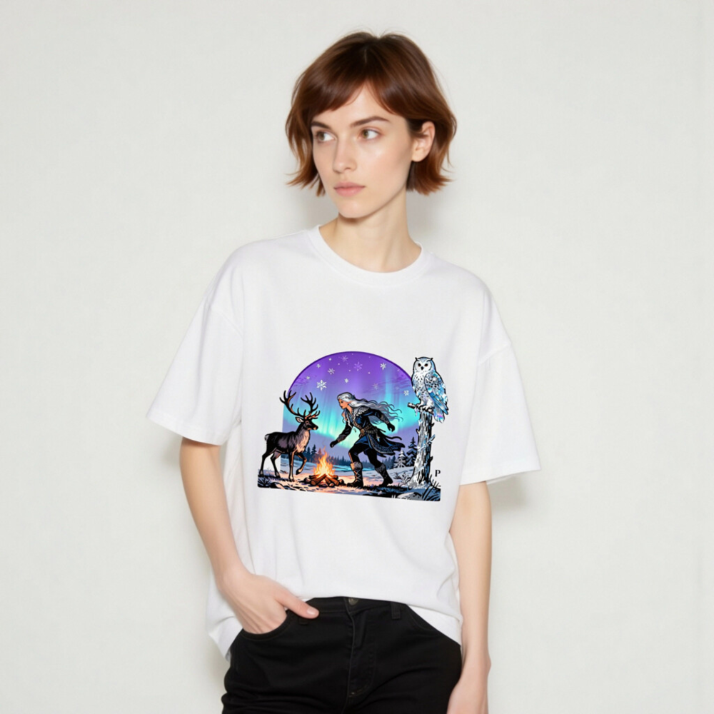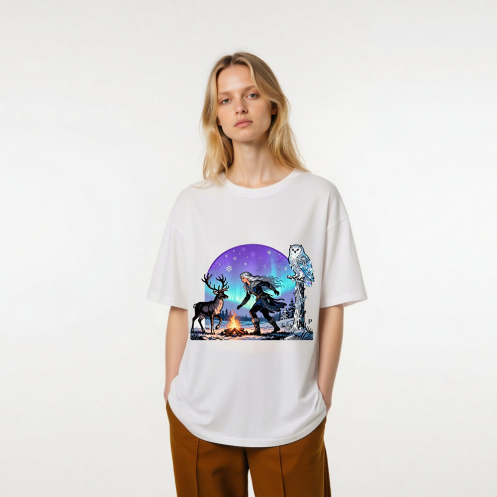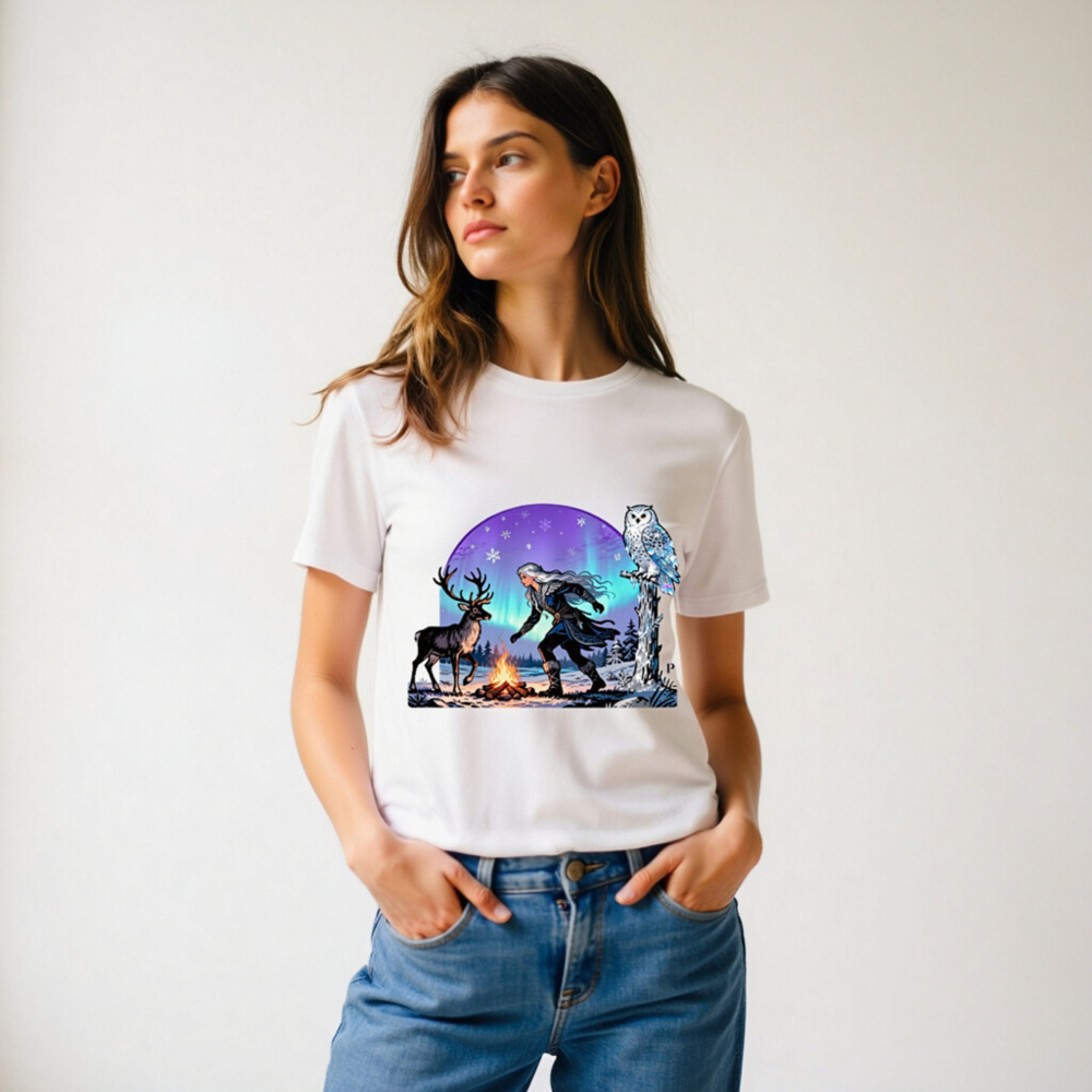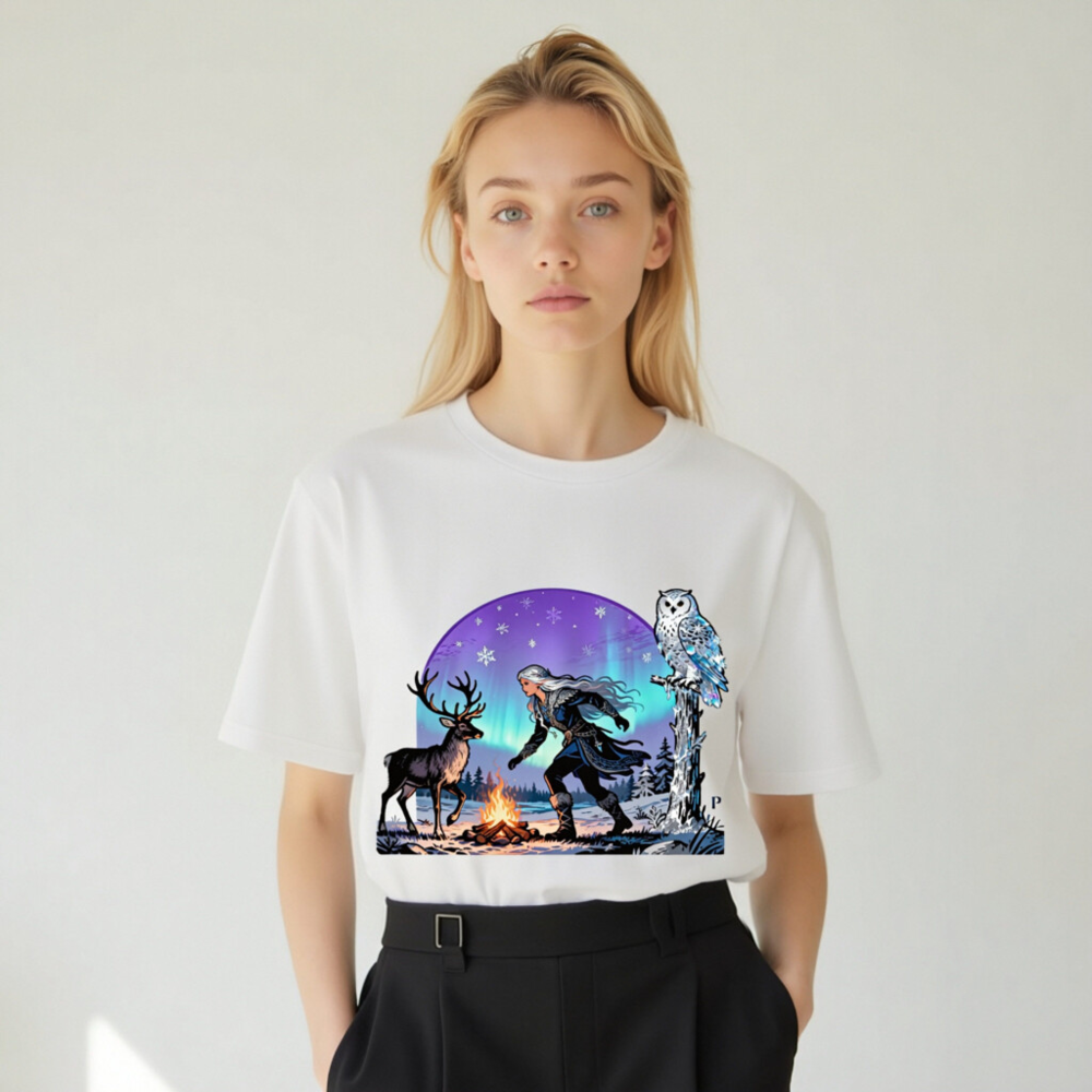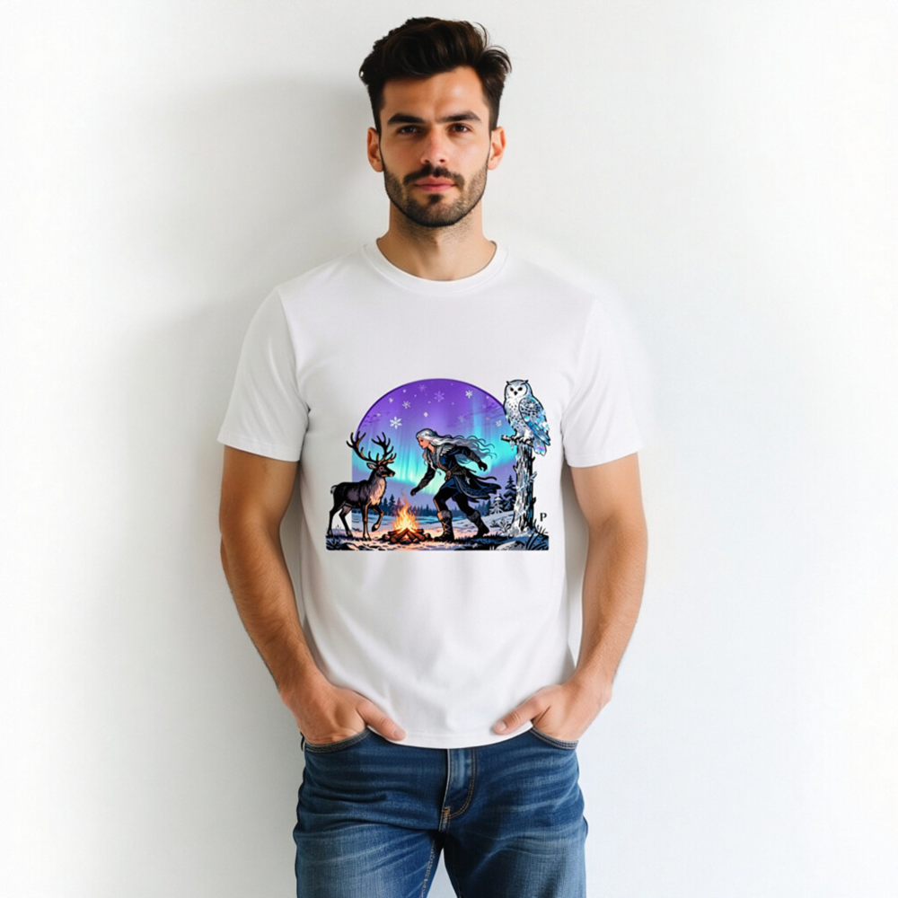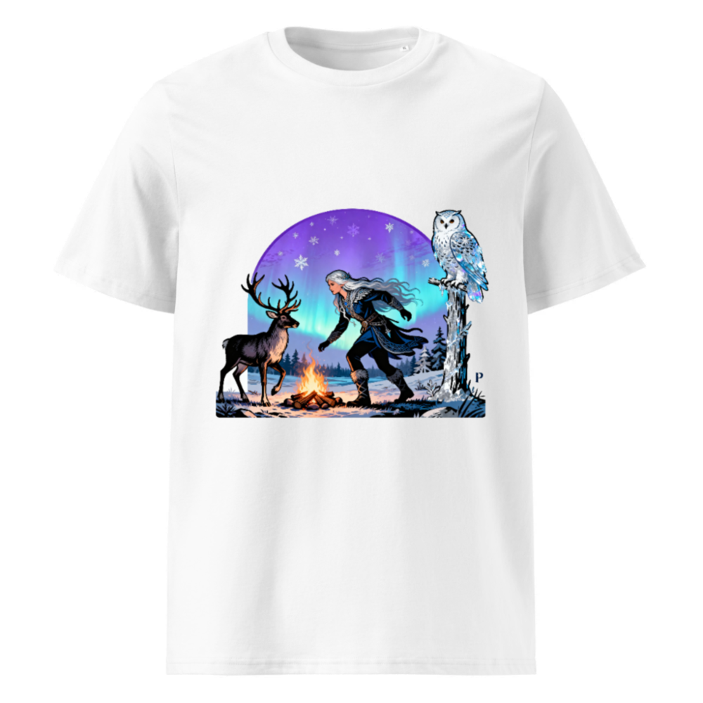 Handcrafted unisex organic cotton t-shirt featuring a magical winter scene: an elf with silver hair, a majestic reindeer, and a snowy owl perched on a frosty tree beside a cozy campfire under the aurora borealis. Eco-friendly, soft, and sustainable—perfect for nature lovers and fantasy fans. Ideal for casual wear or as a unique gift.