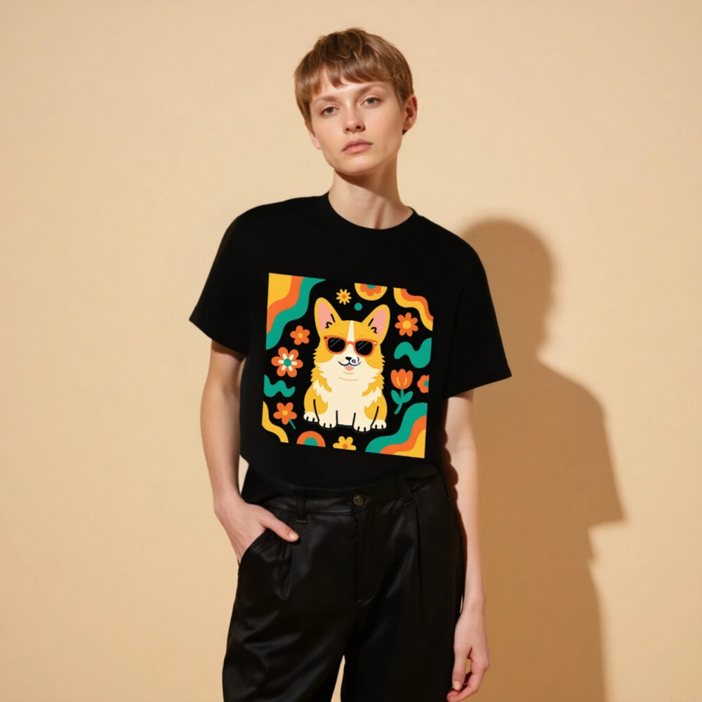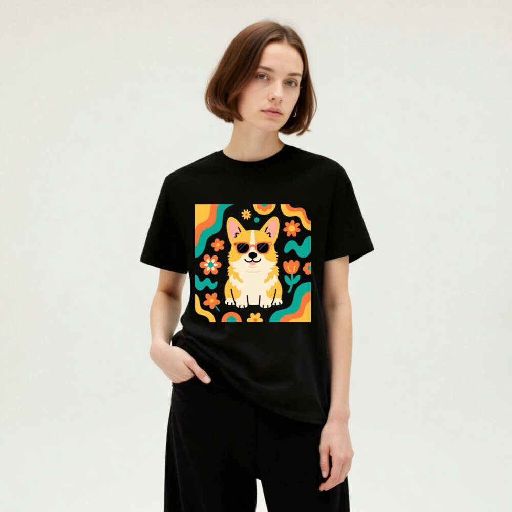 Show off your love for pets and retro vibes with this unisex organic cotton t-shirt featuring a cheerful corgi in sunglasses surrounded by vibrant floral and wave patterns. Made from certified organic cotton for softness, breathability, and eco-conscious wear. Perfect for casual days, gifts, or expressing your playful personality. Sustainable style that’s gentle on skin and the planet.
