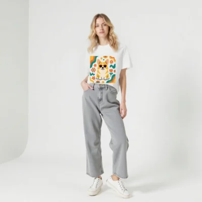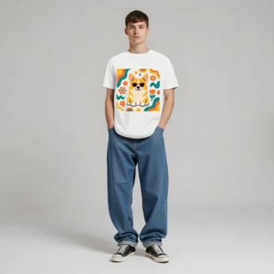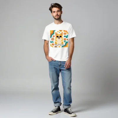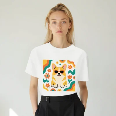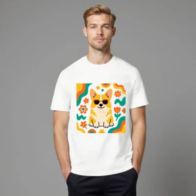 This unisex organic cotton t-shirt features a playful, retro-style design: a cheerful corgi wearing orange sunglasses, surrounded by vibrant orange and teal floral motifs. Made from certified organic cotton for softness and sustainability. Comfortable fit, eco-friendly fabric, perfect for casual wear or gifting. Ideal for dog lovers seeking fun, stylish, and responsible apparel.