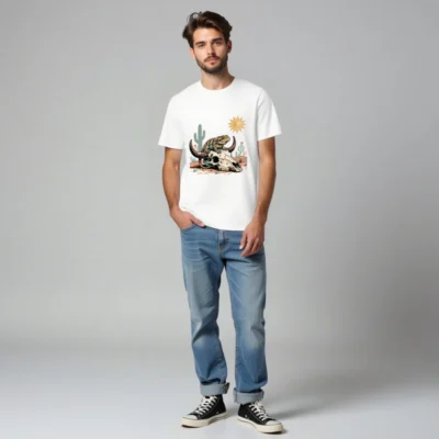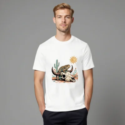A unisex organic cotton t-shirt featuring a vibrant desert-themed design: a lizard perched on a bison skull, with cactus and sun motifs. Soft, eco-friendly fabric for comfortable everyday wear. Designed for casual style with bold southwestern flair—ideal for nature lovers and art enthusiasts.
