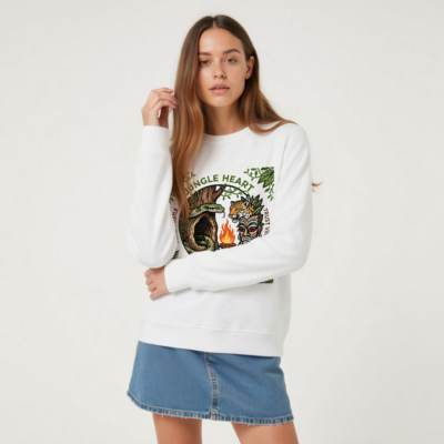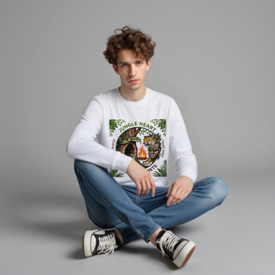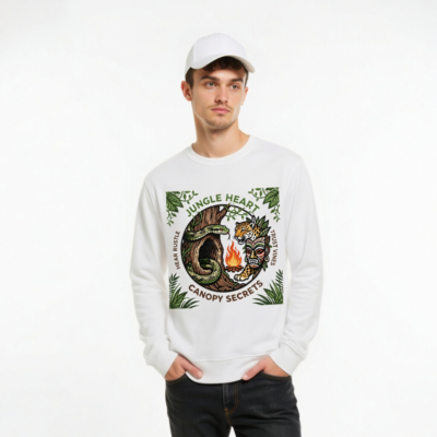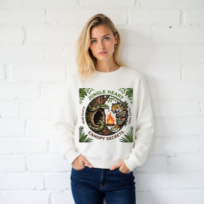 Wear the wild with our Unisex Organic Sweatshirt—featuring a vibrant jungle design with snake, jaguar, and tribal mask around a campfire. Made from certified organic cotton, this eco-conscious piece blends nature-inspired art with sustainable fashion. Perfect for adventurers who value ethical production and bold style. Shop the ‘Jungle Heart’ collection now.