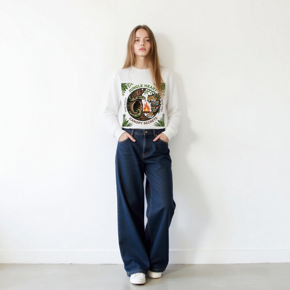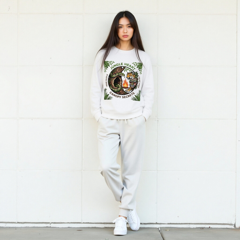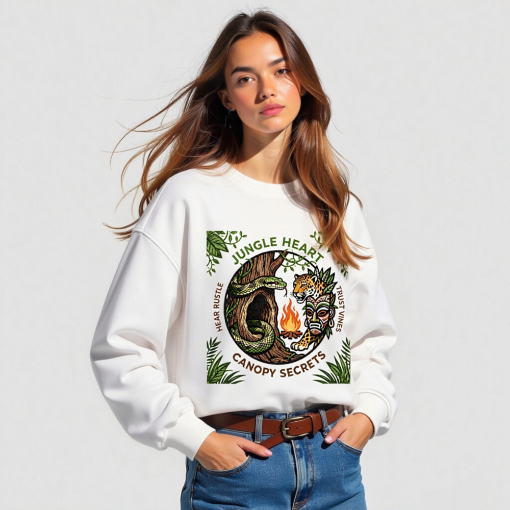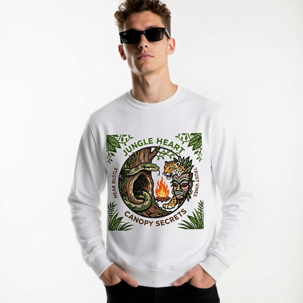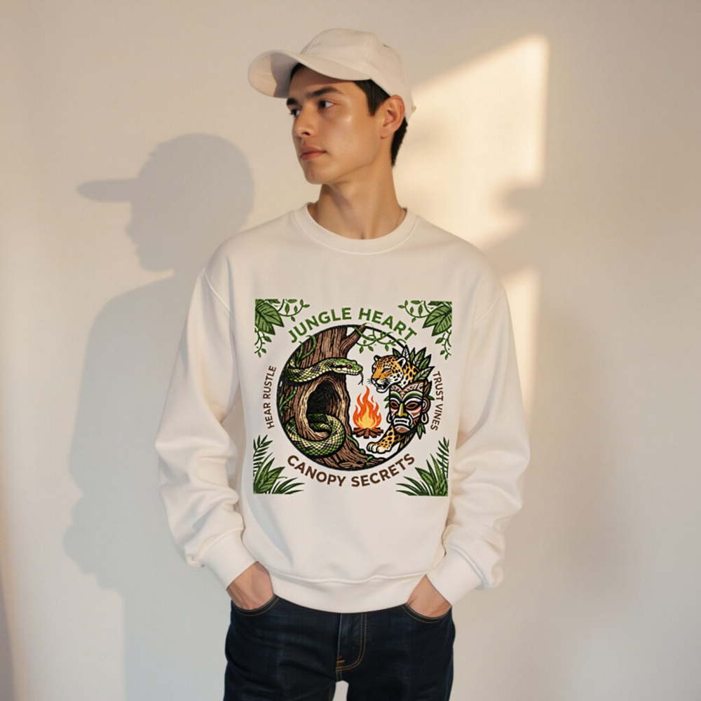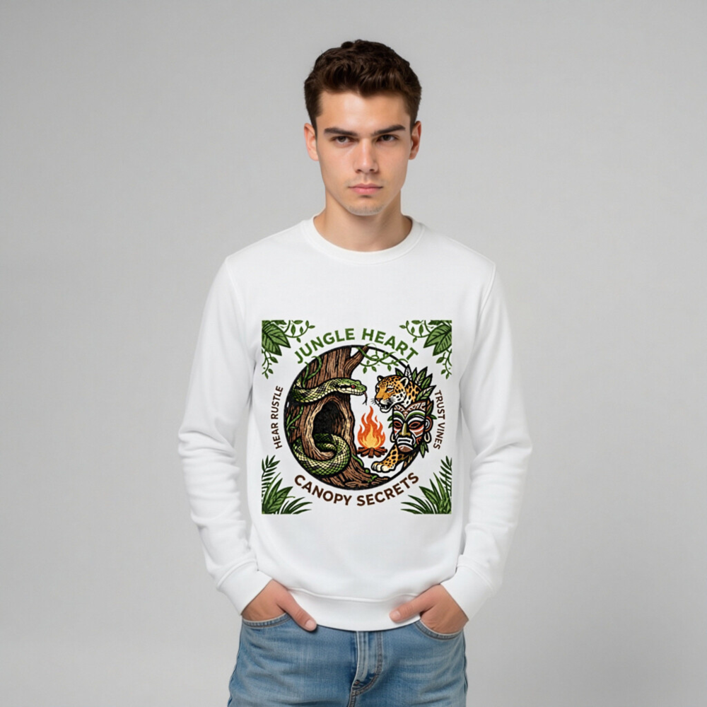 Wear the wild with our Unisex Organic Sweatshirt—featuring a vibrant jungle design with snake, jaguar, and tribal mask around a campfire. Made from certified organic cotton, this eco-conscious piece blends nature-inspired art with sustainable fashion. Perfect for adventurers who value ethical production and bold style. Shop the ‘Jungle Heart’ collection now.