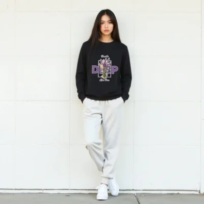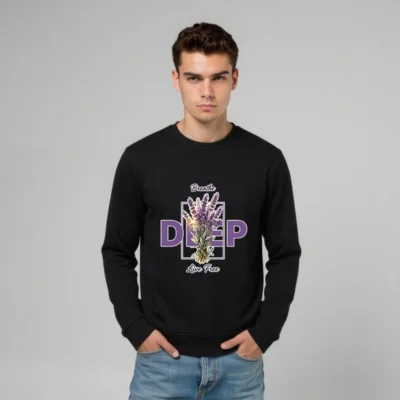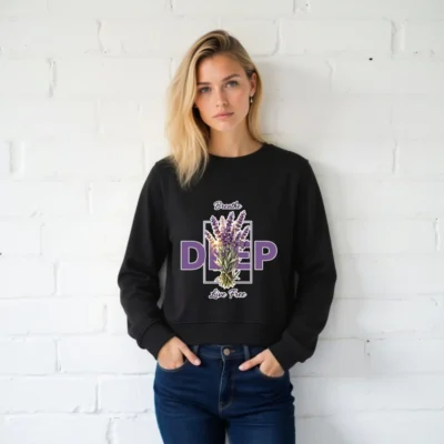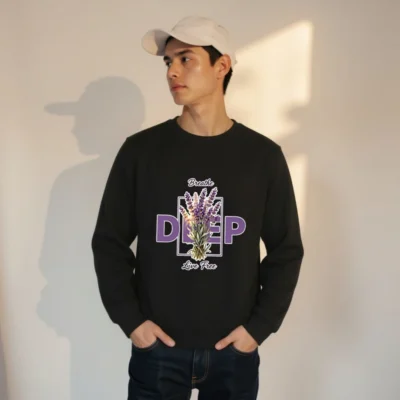 This unisex organic sweatshirt features a calming lavender bouquet design with ‘Breathe Deep, Live Free’ text—perfect for mindfulness and self-care. Made from certified organic cotton, it offers soft comfort and eco-conscious style. Ideal for everyday wear, yoga, or quiet moments. Sustainable, comfortable, and thoughtfully designed to support your well-being.