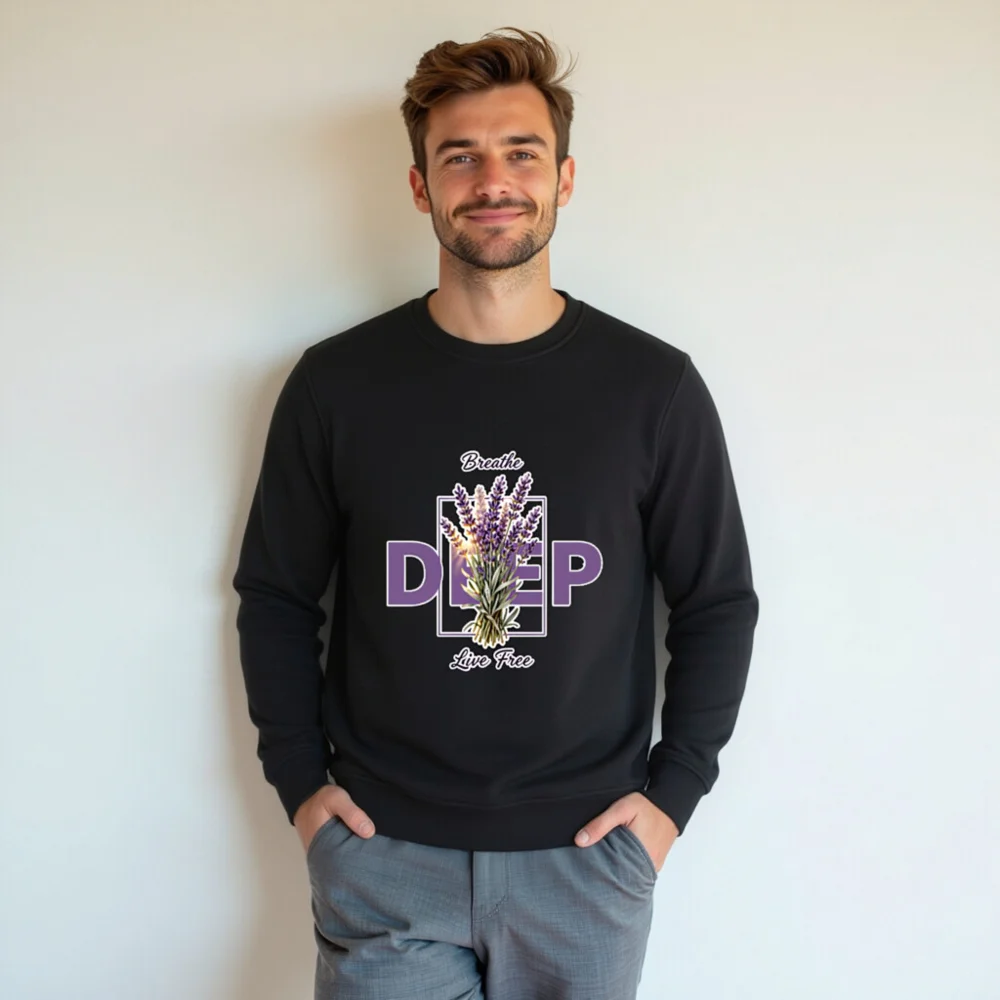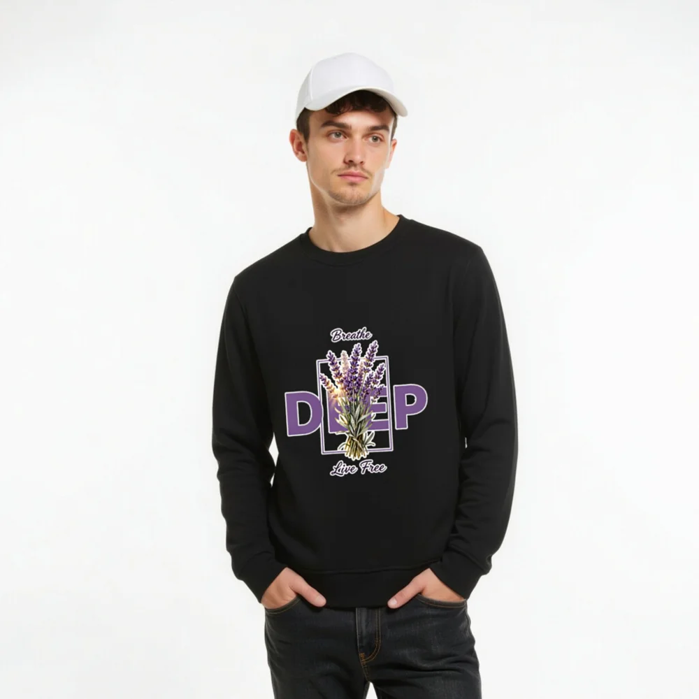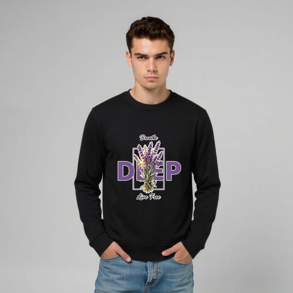 This unisex organic sweatshirt features a calming lavender bouquet design with ‘Breathe Deep, Live Free’ text—perfect for mindfulness and self-care. Made from certified organic cotton, it offers soft comfort and eco-conscious style. Ideal for everyday wear, yoga, or quiet moments. Sustainable, comfortable, and thoughtfully designed to support your well-being.