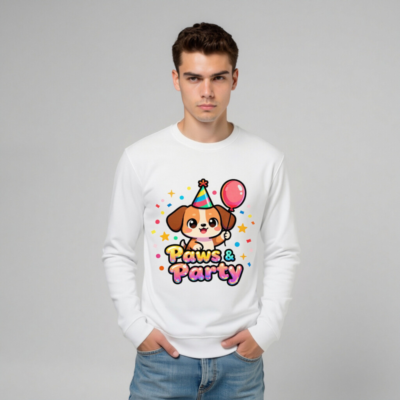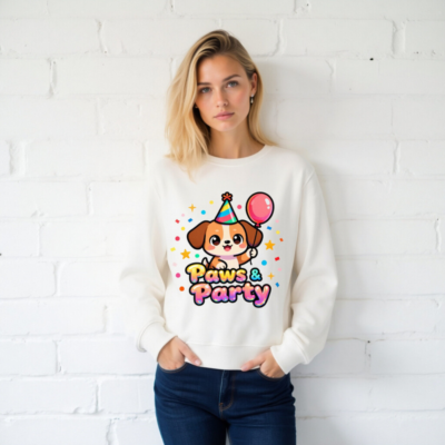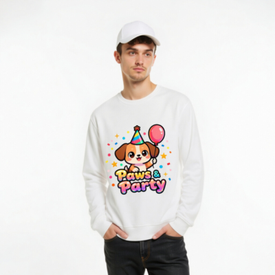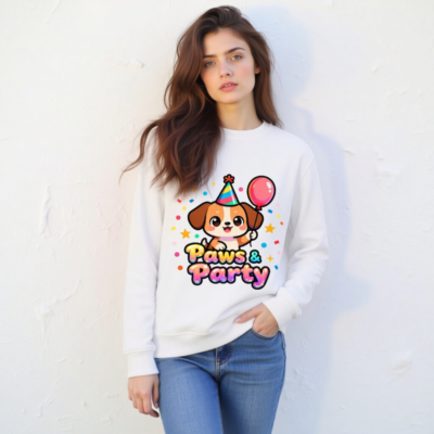 Celebrate in style with this unisex organic cotton sweatshirt featuring a joyful puppy in a party hat holding a balloon, surrounded by confetti and stars. The vibrant ‘Paws & Party’ design is perfect for birthdays, pet lovers, and eco-conscious shoppers. Made from certified organic cotton (GOTS-certified), it’s soft, sustainable, and machine-washable. Ideal for kids and adults who love playful, planet-friendly fashion.