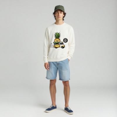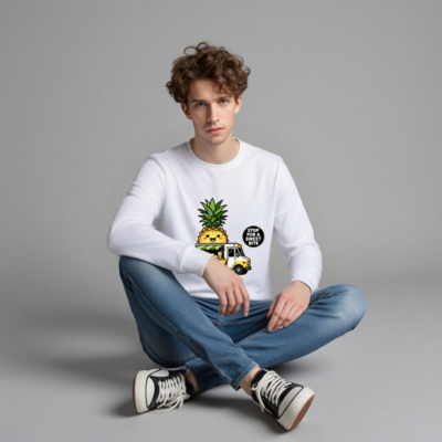 Adorable unisex organic sweatshirt featuring a kawaii pineapple character running a yellow food truck with fresh juice and pineapple slices. Soft, eco-friendly fabric made from certified organic cotton. Perfect for fruit lovers and sustainable fashion fans. Designed for comfort and playful style — wear your love for tropical vibes every day.