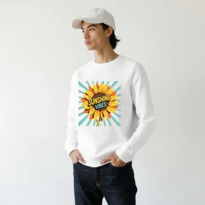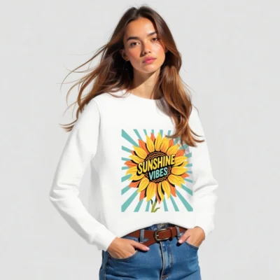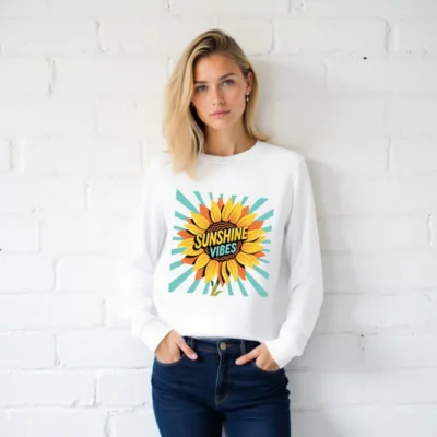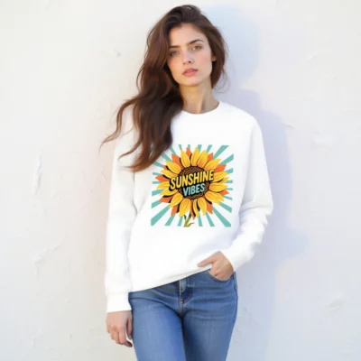 This unisex organic sweatshirt features a vibrant sunflower graphic with ‘Sunshine Vibes’ text and retro-style rays. Made from certified organic cotton, it offers comfort, sustainability, and cheerful style—perfect for everyday wear. The relaxed fit and soft fabric make it ideal for all genders. Eco-friendly, ethically crafted, and designed to spread positivity.