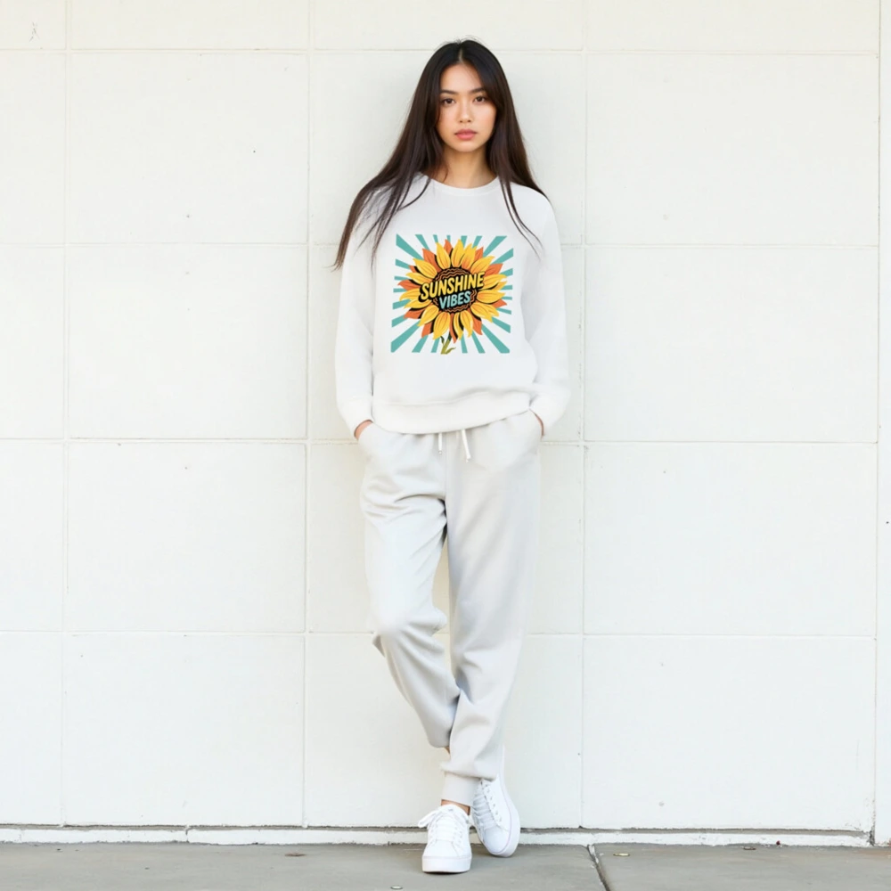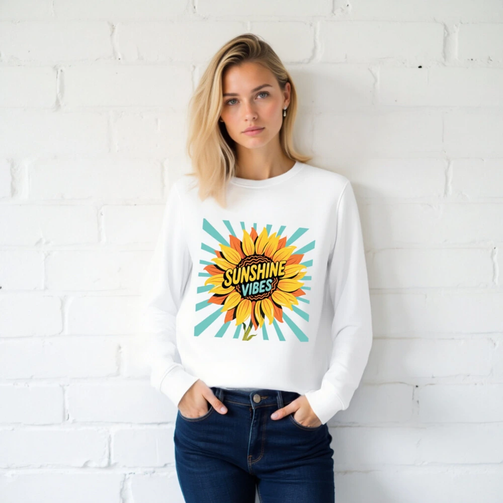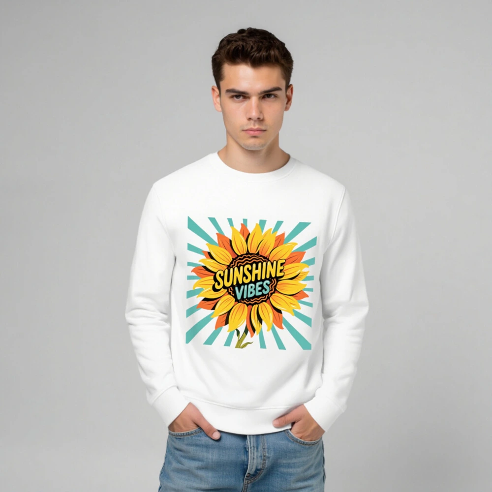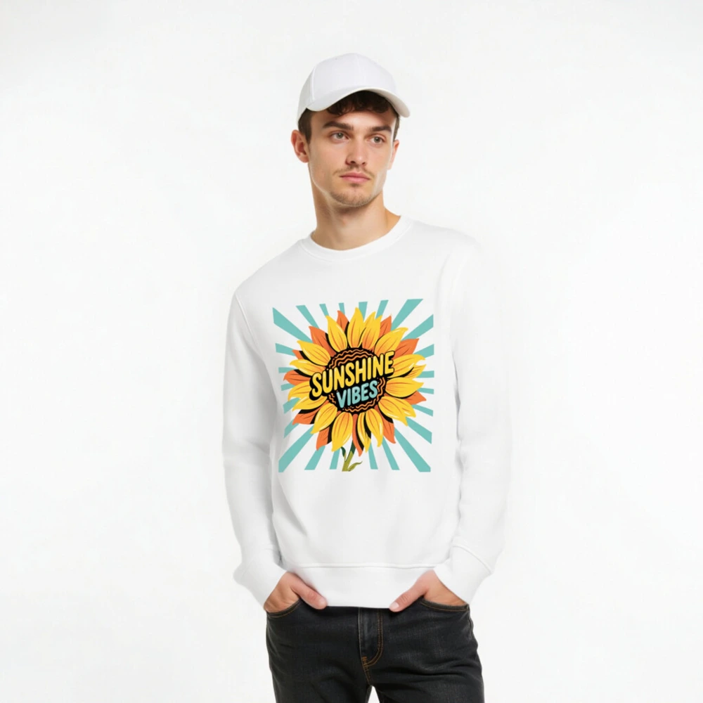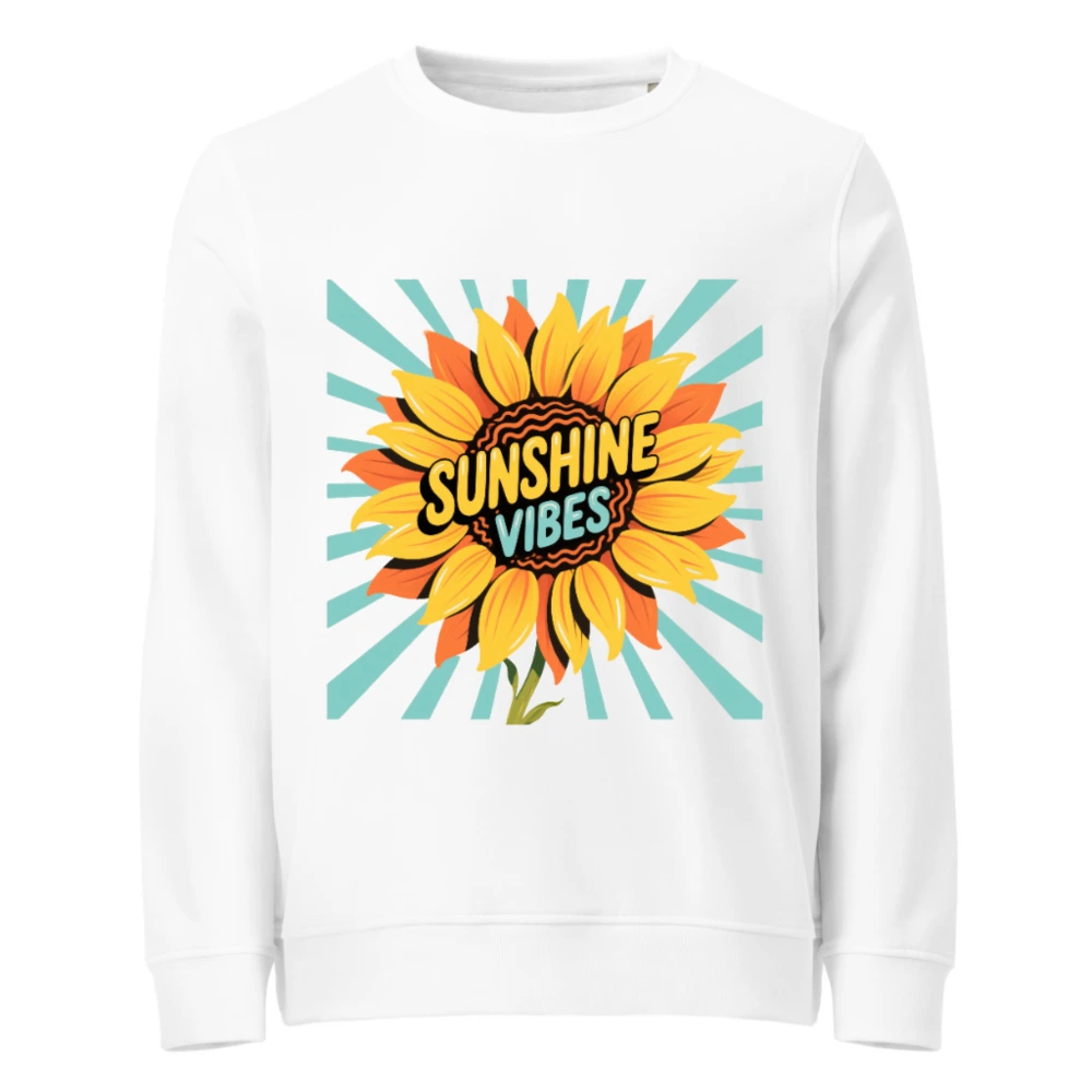 This unisex organic sweatshirt features a vibrant sunflower graphic with ‘Sunshine Vibes’ text and retro-style rays. Made from certified organic cotton, it offers comfort, sustainability, and cheerful style—perfect for everyday wear. The relaxed fit and soft fabric make it ideal for all genders. Eco-friendly, ethically crafted, and designed to spread positivity.