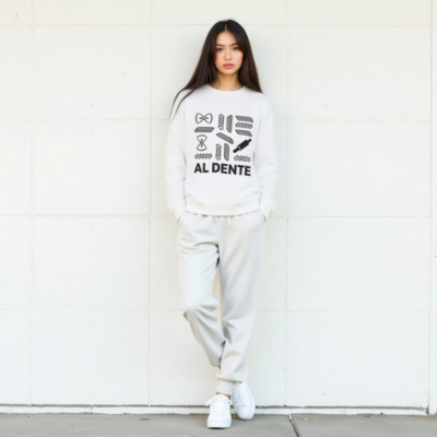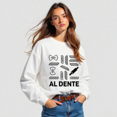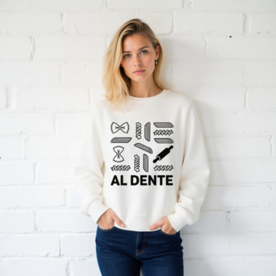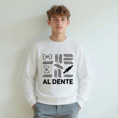 This unisex organic sweatshirt features a playful ‘Al Dente’ pasta-themed graphic with bowtie, penne, fusilli, and more—perfect for food lovers. Made from certified organic cotton, it’s soft, sustainable, and machine-washable. The bold black-on-white design stands out while honoring Italian culinary tradition. Ideal for casual wear or as a thoughtful gift. Ethically produced with no synthetic additives.